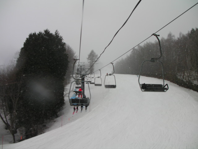黒姫エリア?に戻ると、しらかばCでプライズ検定が始まっていました。天候が悪いので今日は見学はぜず、ひたすら滑走です(笑)第1クワッド945mを使って滑る黒姫のメイン、しなの木Cを滑りました。右手に見えているのはからまつCですが、ネットとロープで規制して長野市Jrが独占使用していて滑走不可でした。ここしなの木Cは滑走者が一番多いので、この時間で既に荒れ荒れでした。