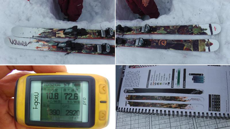 いざ未圧雪バーンへ。Aコース側はずっと左落ちの片斜面でトラバースしてはフォールラインへ、の繰り返しで滑走ラインを選んでいるうちに滑りきってしまった感じでしたorzトップのロッカー形状と幅広なプロポーションで未圧雪も楽々でした。