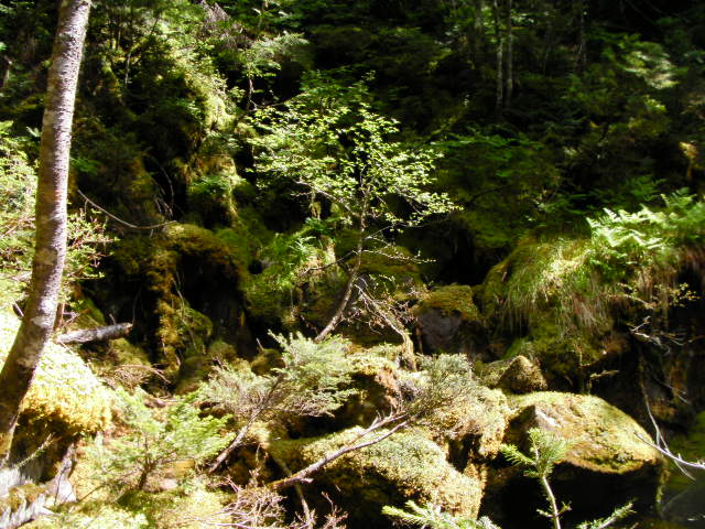 麦草峠から雨池&八柱山へ向かう登山道を右手に少し入った所にある地獄谷です。いかにも噴火口だったというような佇まいで、急な斜面を降りると水の溜まった池がありました。斜面からの倒木や岩にビッシリと生えている苔がワイルドでした。最後湖面に靄が発生し、恐怖映画の効果シーンのようで背筋が凍るような気がしましたorz