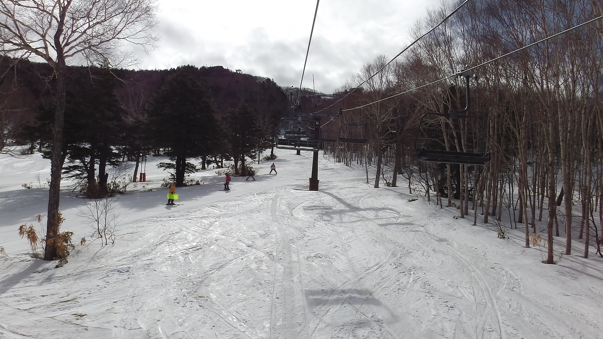 柔らかな新雪が積もっているイメージのあるタンネの森オコジョスキー場ですが、今日は漏れなく湿雪の重い雪でした。いつもは斜め横断するだけですが、今日はクワッドが動いているのが見えたので乗車に向かいました。