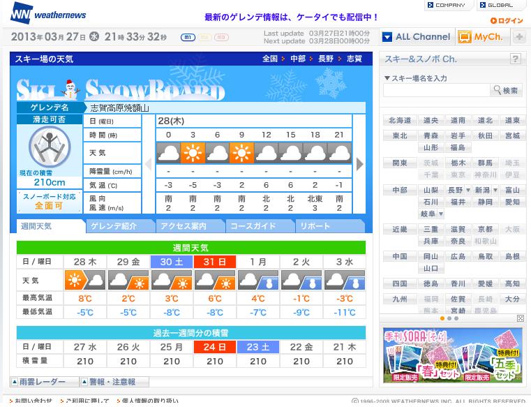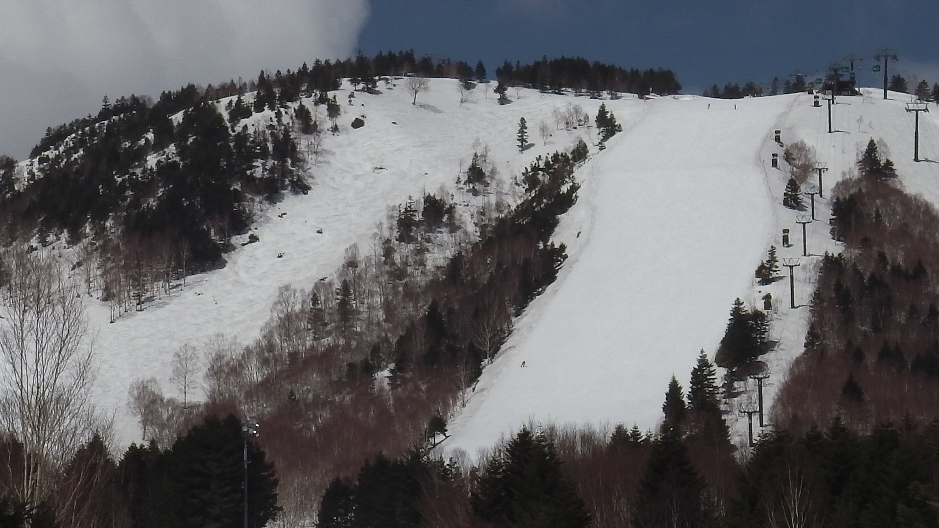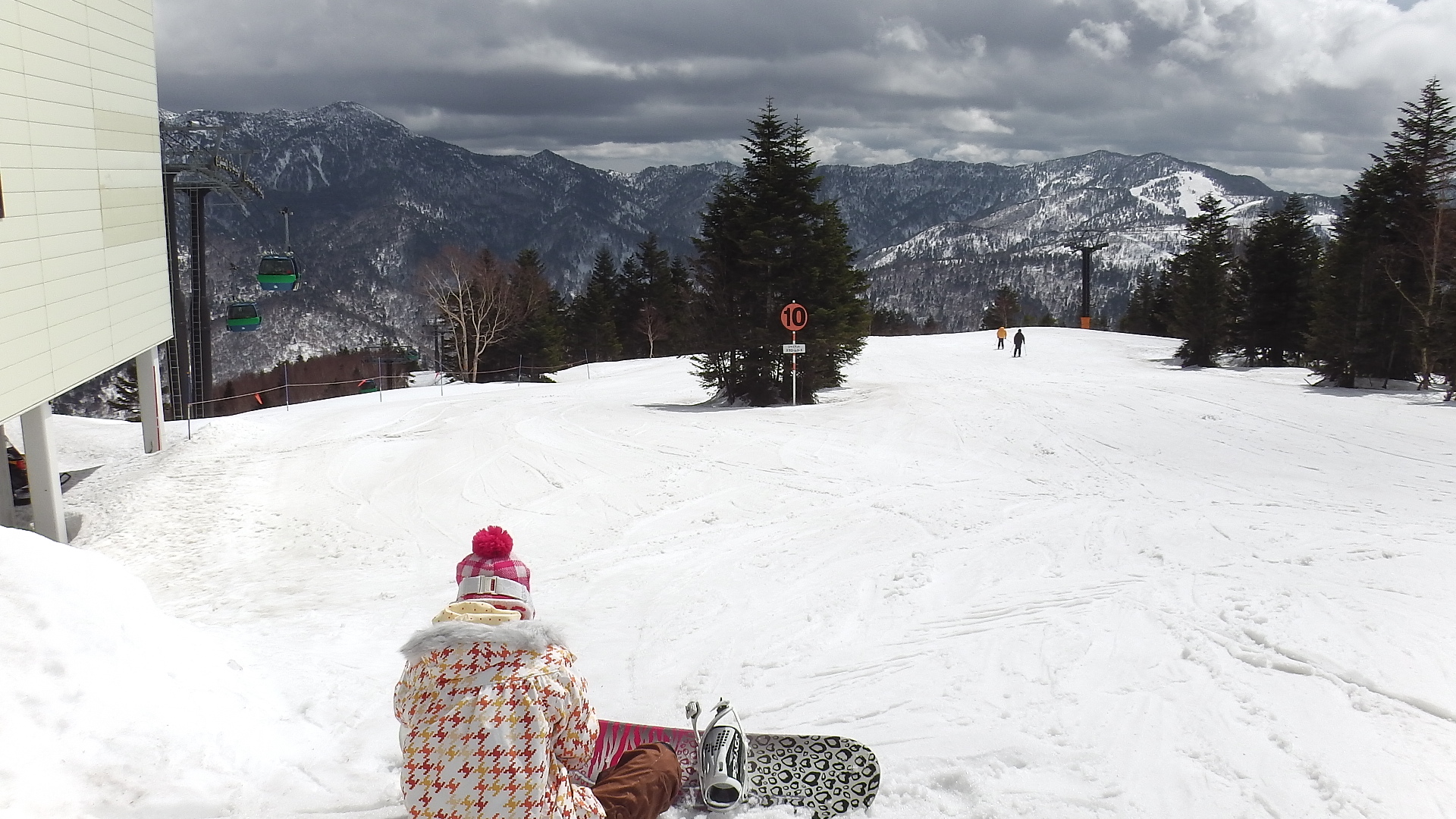 2ゴン山頂駅からのジャイアントスラロームコースの滑走です。山頂駅の温度計は8度を指しており、標高2000mのヤケビでも緩々でした。妖怪の潜む緩斜面では推進力の無いボードは止まってしまい、ストックで引っ張りながら加速しました。ヤケビは広くて派生もあるので、初来場の娘が迷子にならないよう細切れ滑走ですorz