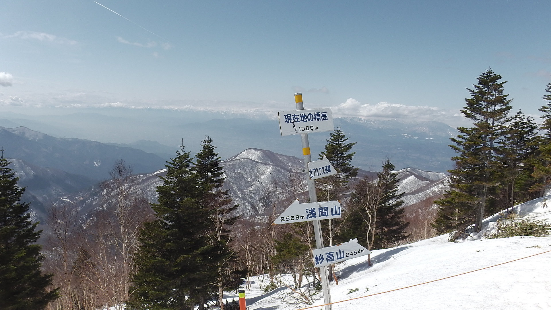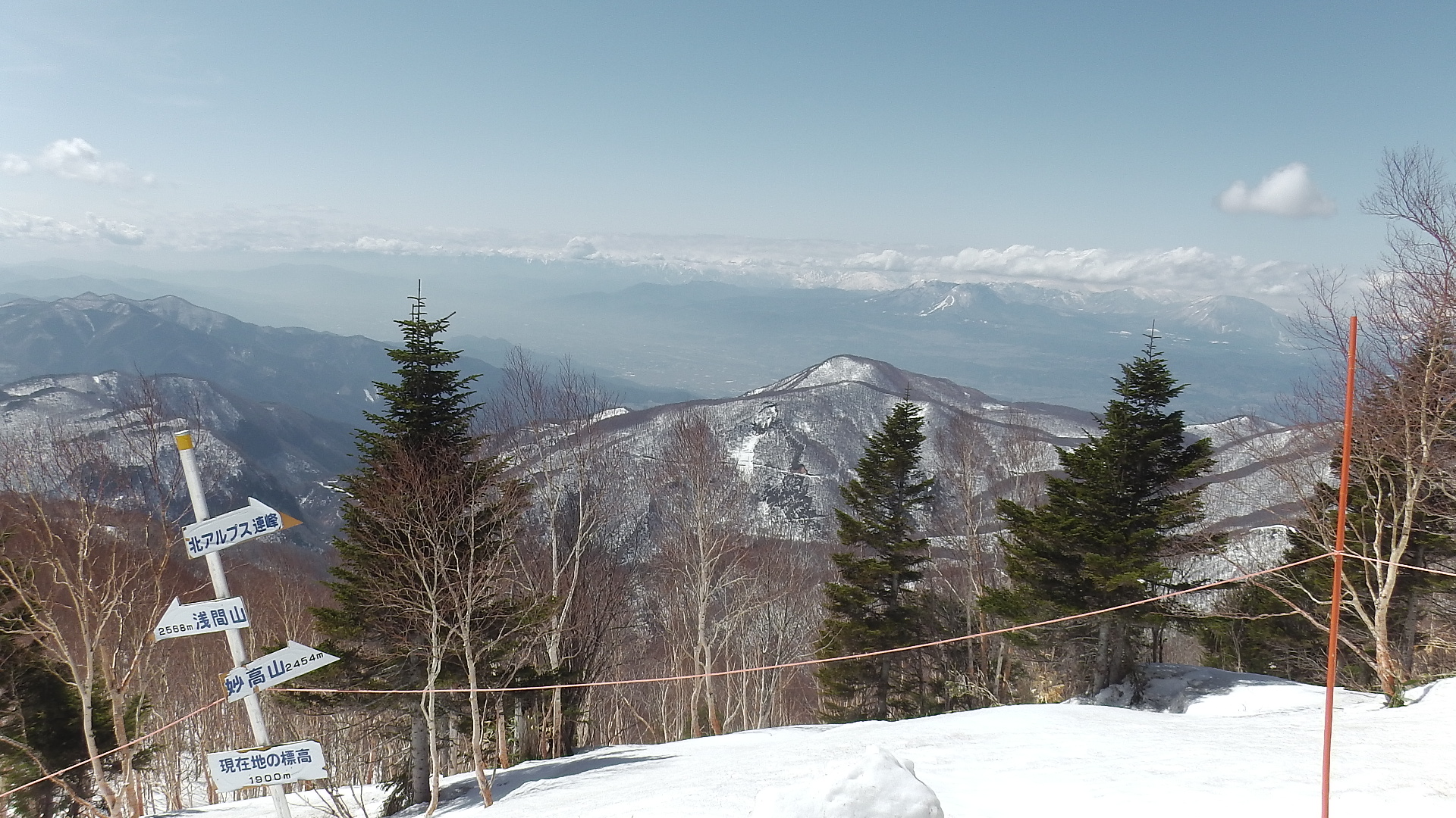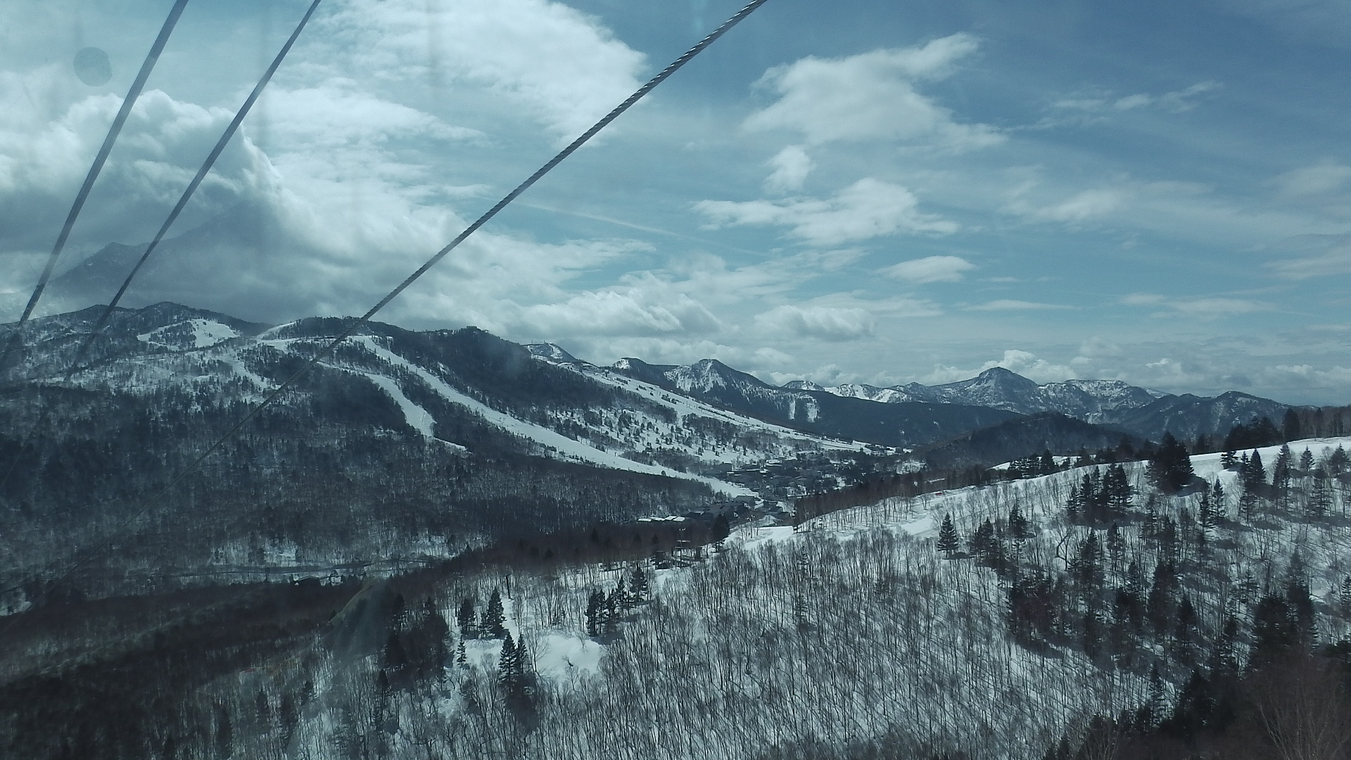 2ゴン山頂駅から第1展望地までのパノラマアウトの滑走です。ここは2ゴン回しのメインルートですので滑走者も多く、緩斜面ながらそれなりに荒れていました。 近くの山(飯縄/黒姫/妙高など)は山頂まで見えていましたが、北アルプスは雲がかかってピークは見えませんでした。