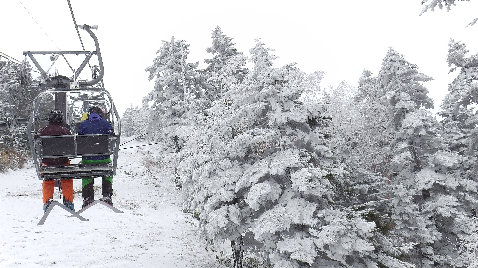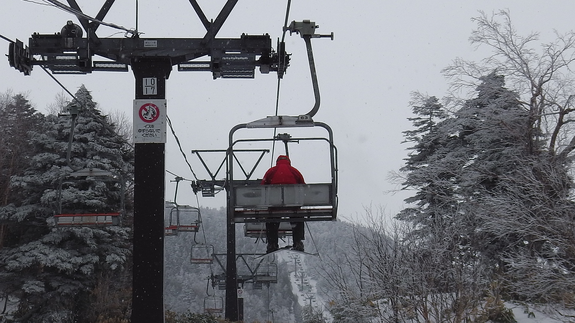 渋峠から戻って、横手山1本目の滑走です。小雪ながら若干降雪も始まってきました。キングコースは硬く凍りついたバーンの上に薄っすら雪が乗った状態で気を抜けませんでした。第2ゲレンデは大会があるらしく、ネットで仕切られて狭いバーンになっていましたが、次に滑ってくると、大会で使う左側のやや広めのバーンが開放されていました。