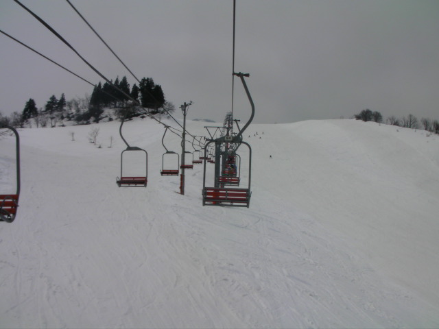 リフトの左側を滑る、このスキー場のメインコースです。スキー・スノーボードに混じってソリもリフトを使って滑っていました。ソリの3本線の滑走跡が深く、テクニカルでした(苦笑)