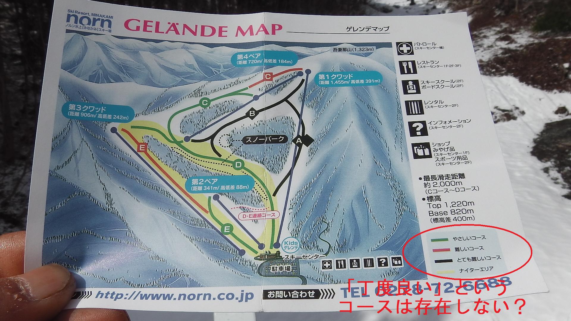 937 何気なく見ていたコースマップ。 「やさしいコース」「難しいコース」「とても難しいコース」の3種類で、「丁度手頃なコース」(一般的には中級コースか?)は存在しないようです(苦笑)