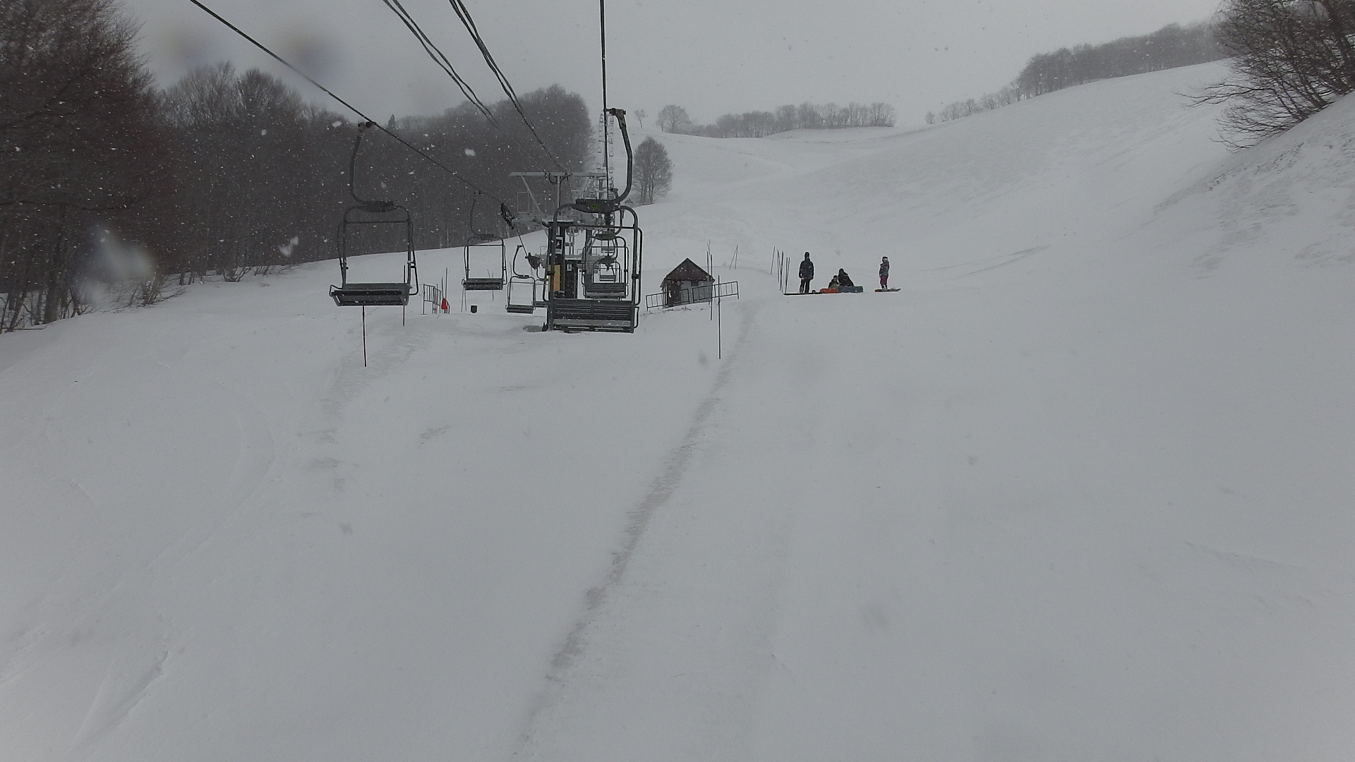 下のリフトから上のリフトへの乗り継ぎです。この辺りは普通のスキー場ですが、見える景色はスキー場とは思えない地形そのままの裸山にリフトが架かっているという感じです。その地形が判るようにリフト乗車しても暫くカメラを回してあります。