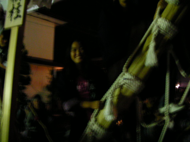 子供たちによる花笠踊りの披露です。暗闇と御柱の熱気で子供達もハイテンション?