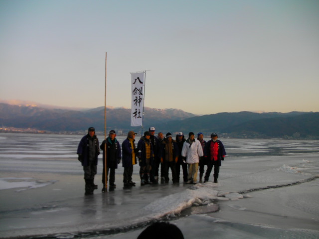 氷の厚さを測るためにヨキで氷を割った所です。厚さは13cmとの事。氷を割って厚みを測定した方はわが地区の総代TUさんです。以前勤めていた会社の先輩だったり(笑)白い服の方が八剣神社の神主の宮坂清宮司さんです。