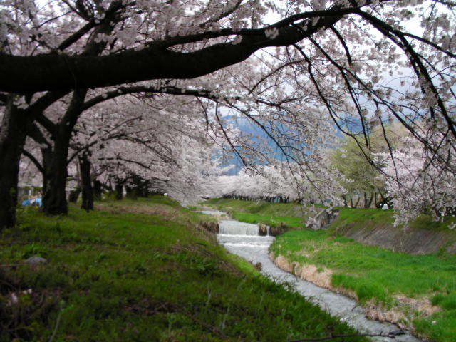 上川左岸の赤沼区にある堤桜です。ここは古木が多く、道路に垂れ下がった枝がまるで桜のトンネルのようになりますが、今年は枝払いしてしまったようで、若干迫力に欠けました。