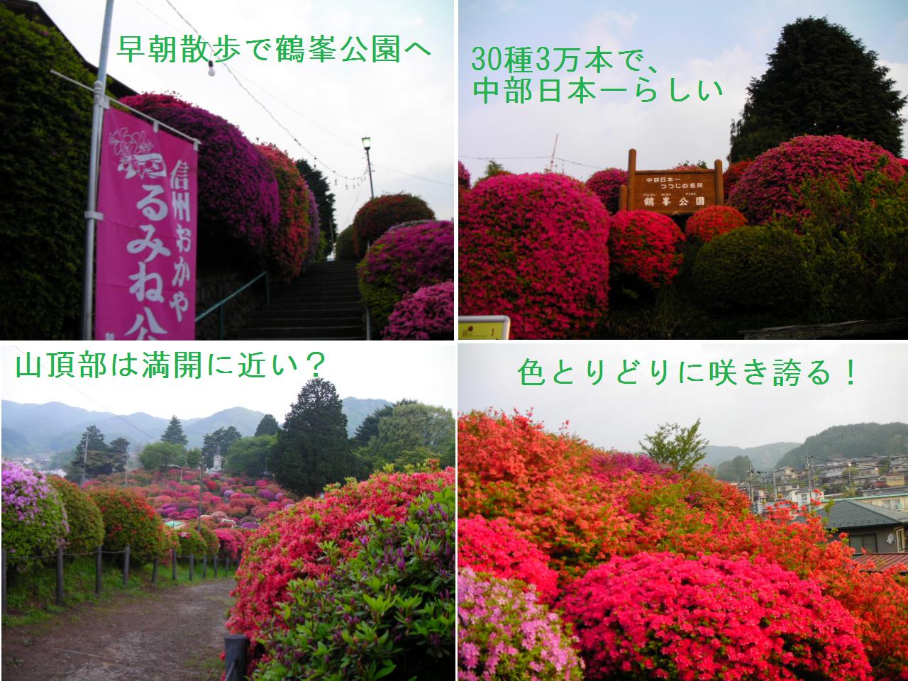 TVやラジオで見頃を迎えたとの報道があったので、つつじの名所、岡谷市川岸の鶴峰公園へ出掛けて来ました。日中は混み合うと思ったので、早朝の散歩です。 昨年に比べやや花数が少ないような感じもしましたが、色とりどりに咲き誇るつつじに癒されてきました。30種類3万本のつつじが植えられているそうです。