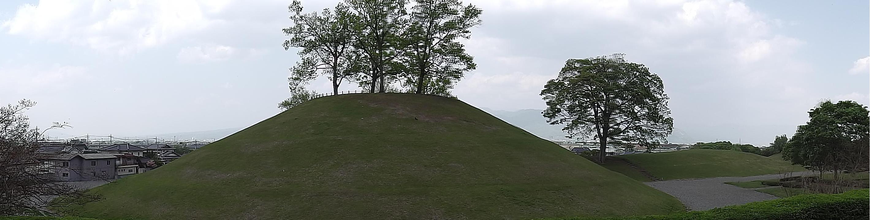 銚子塚古墳附(つけたり)丸山塚古墳。5世紀初めに作られた山梨県最大の円墳で、銚子塚古墳より少し後に造られたもので、銚子塚に次ぐ権力者の墓と考えられている。 墳丘の直径72m、高さ11mで二段築成。