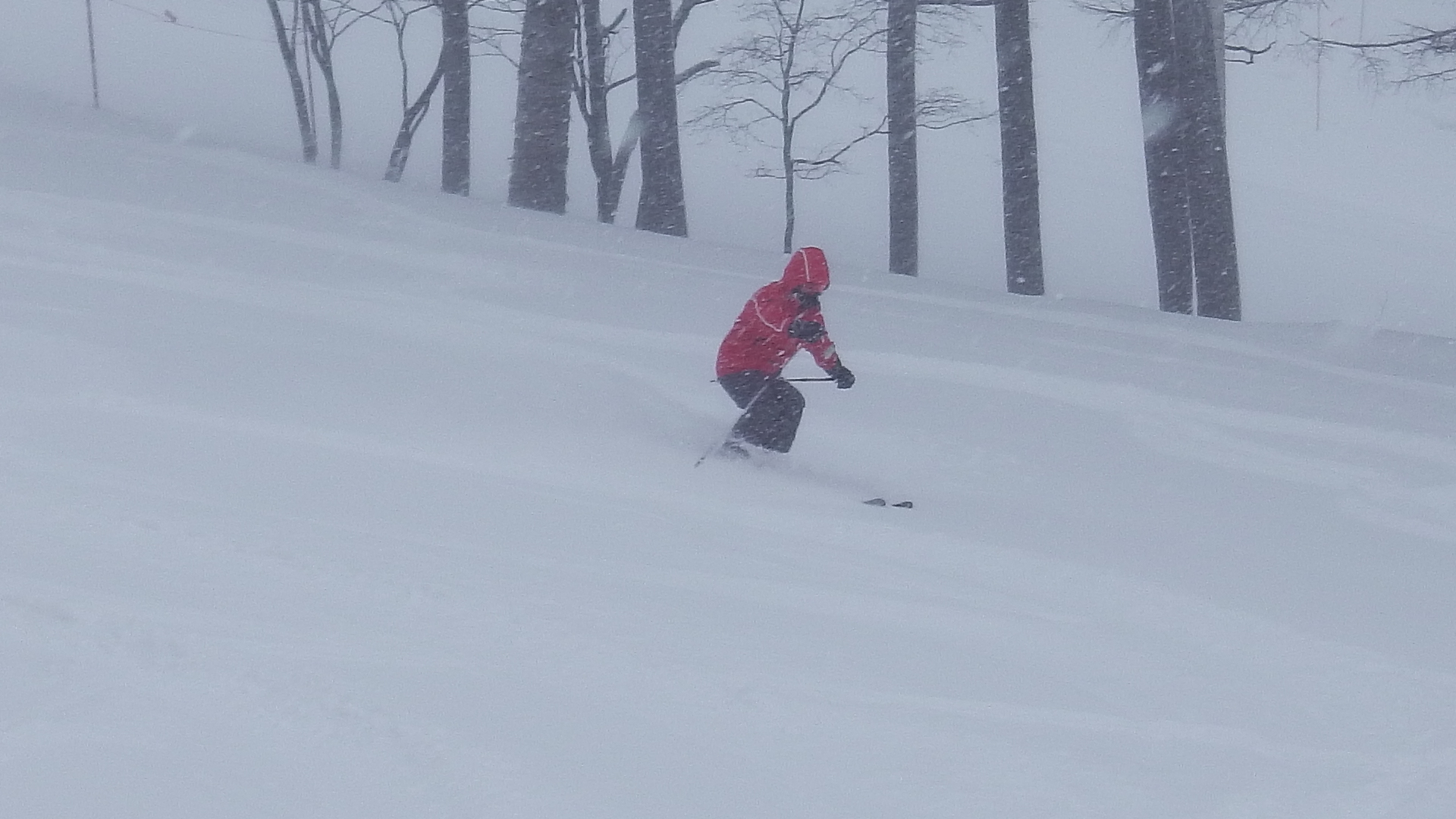 第1クワッド(945m)が定刻よりかなり早く運行開始となったので、1番乗車で滑走開始です。 生憎の吹雪模様で雪面も起伏も良く見えませんorz恐々のファーストランです。 緩んだ雪を圧雪したのが凍った感じ(ザラメの塊のような感じ?)の下地の上に新雪が積もって一見極上バーンに見える状態でしたが、まだ積雪量が少ない(足の甲パウ程度)ので、下地のゴリゴリ感がダイレクトに伝わってきます。