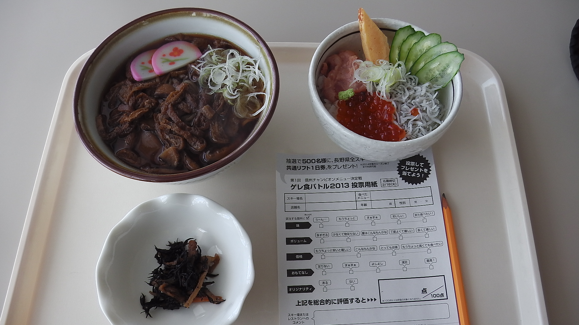 両コースとも空いていたので高速滑走できました。 少し早めですが、午後の会場への移動があるため、レストラン白山へピットインです。 ゲレ食バトル参戦の「新・山ちゃん定食」を頂きました。