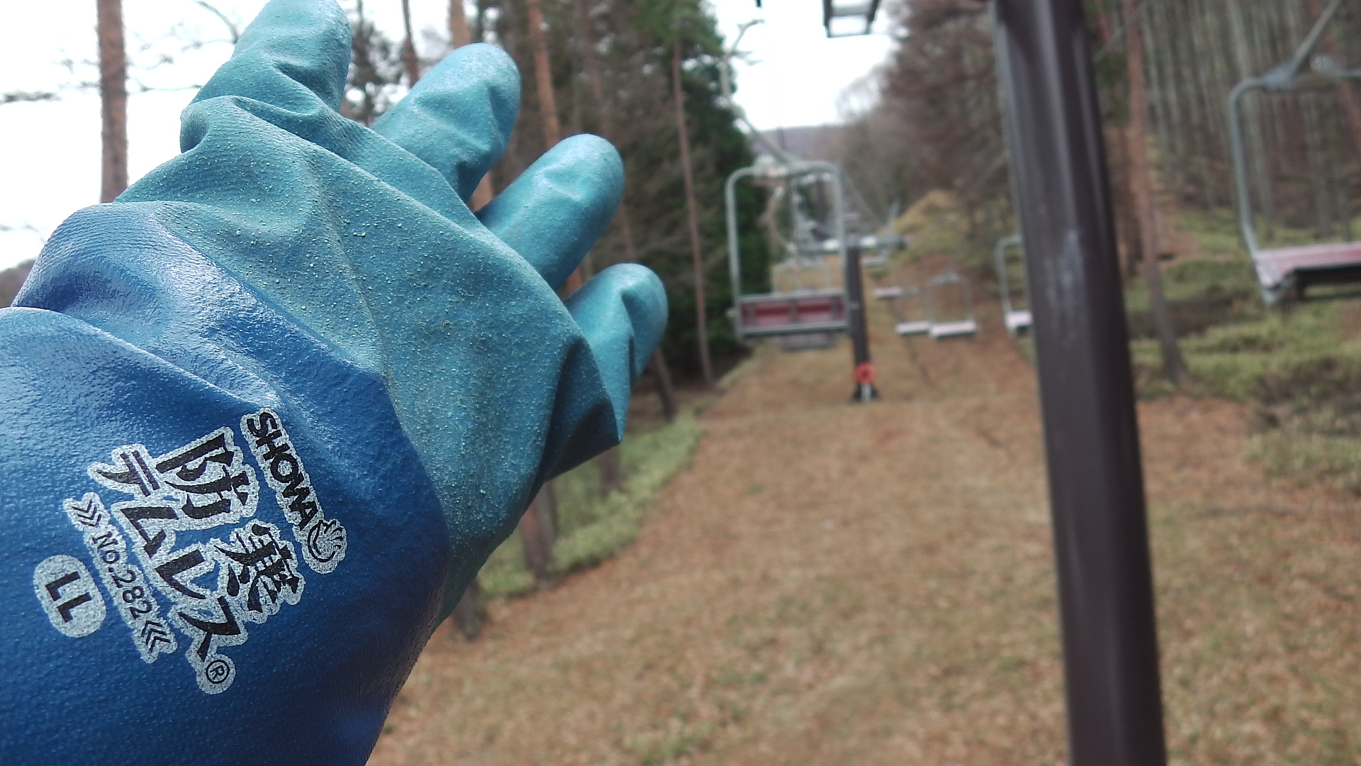 センターハウス前からゴンドラ山麓駅方向には歩いたり漕がないとたどり着けないので、リフトの力を借りて滑り込み作戦としました。まだ雨は降っていませんが、疲れたのでこれで上がりで~すw (ゲレンデ右側の黒いエリアは汚れです。土が透けているわけではありませんでした)