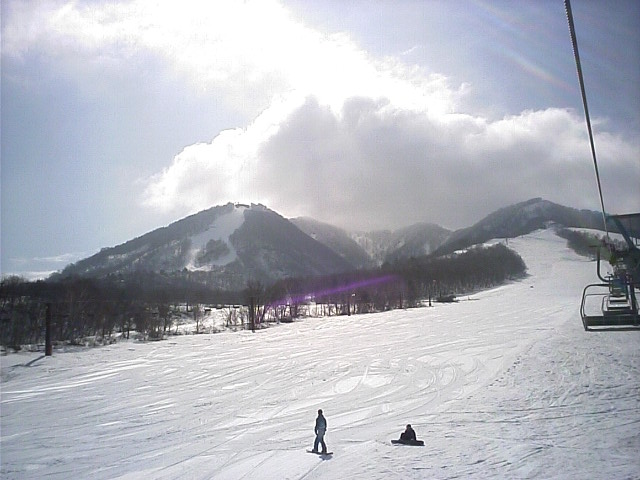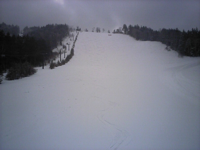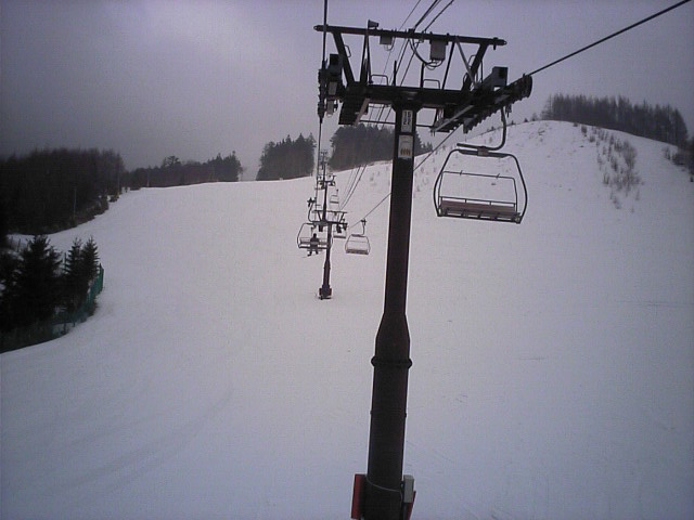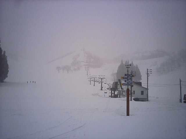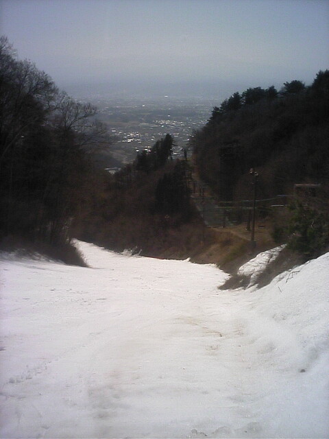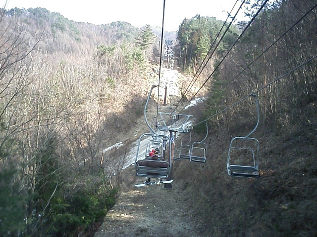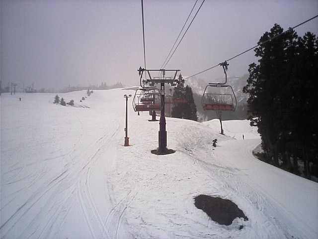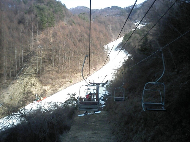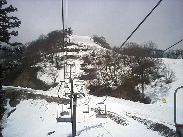 南の良い状態に比べ北はかなーり悲惨な状態でした。アレグロCは既に土がかなり露出した状態で閉鎖。デュエットC(カブトムシC)はリフト故障も一因か造雪せず閉鎖。山頂から繋がるカンタンテCの上部部分も山頂と同じく土露出寸前で水溜りが川に成り掛けのような状態でした。比較的安定していたのはレガートCでしたが、下部が緩斜面の為リフト乗り場まで滑り込めず、苦労しました。 で、一番楽しかったのが「リフト」 自然の地形に逆らわず支柱を立ててあるため、起伏通りにアップダウンがありましたw浅間第4ロマンスに至っては降り場は下っています(↑画像)鹿島槍~青木湖の連絡リフトのような恐怖感はありませんが、リフトが下がる感覚は新鮮でした! |