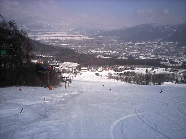 カシオペア第2高速リフト 林間Cスタート地点辺り?野沢温泉の下部と北竜湖が見える。野沢は終日下部しか見えなかった。カシオペア第3リフト(シングル)は運休で最上部へは行けなかったorz