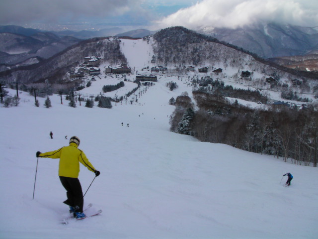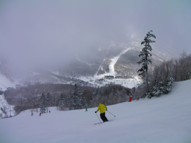 「志賀高原で2番目に標高が高く、雪は固まることを知らない屈指の粉雪。晴れた日にベースの山小屋風のレストランのサンデッキで飲む生ビールが最高です。SOPHIAの松岡充さんお気に入りのスキー場。」と案内にあります。右手の林をメインに滑ってみました。皆さん良く知っているようで滑走跡多数でした(笑)
