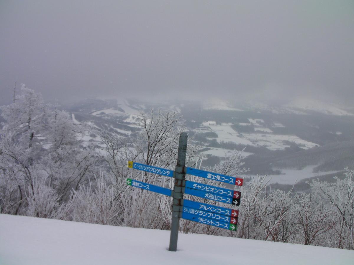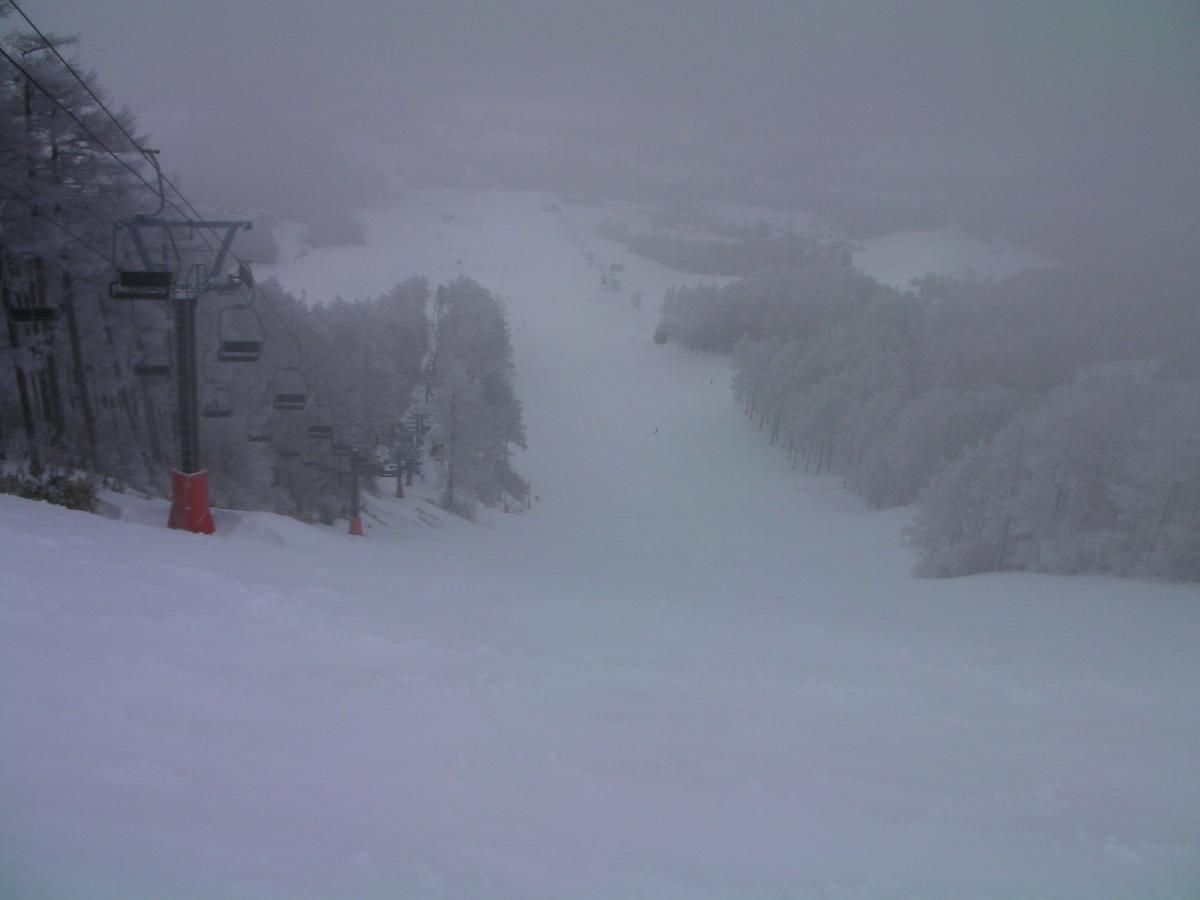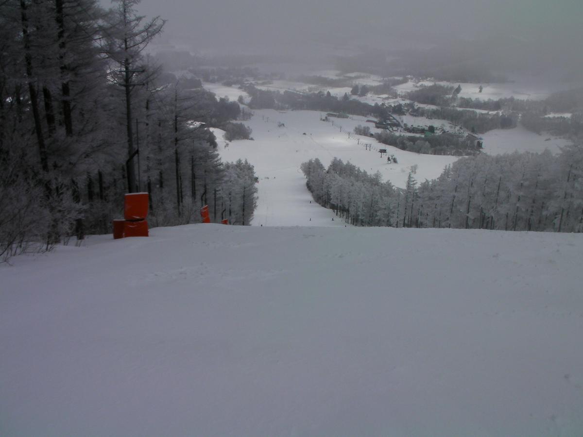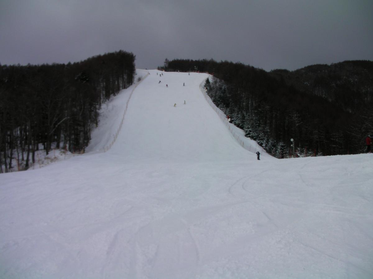 天候回復を待ちましたが好転しないので引き上げます。山頂から富士見C→チャンピオンCと繋ぎ滑りました。来場者は9割レーサー、残りがレジャースキー&ボードという感じでした。圧倒的にスキーヤーが多く、ボーダーは絶滅危惧種という感じのスキー場でした。
