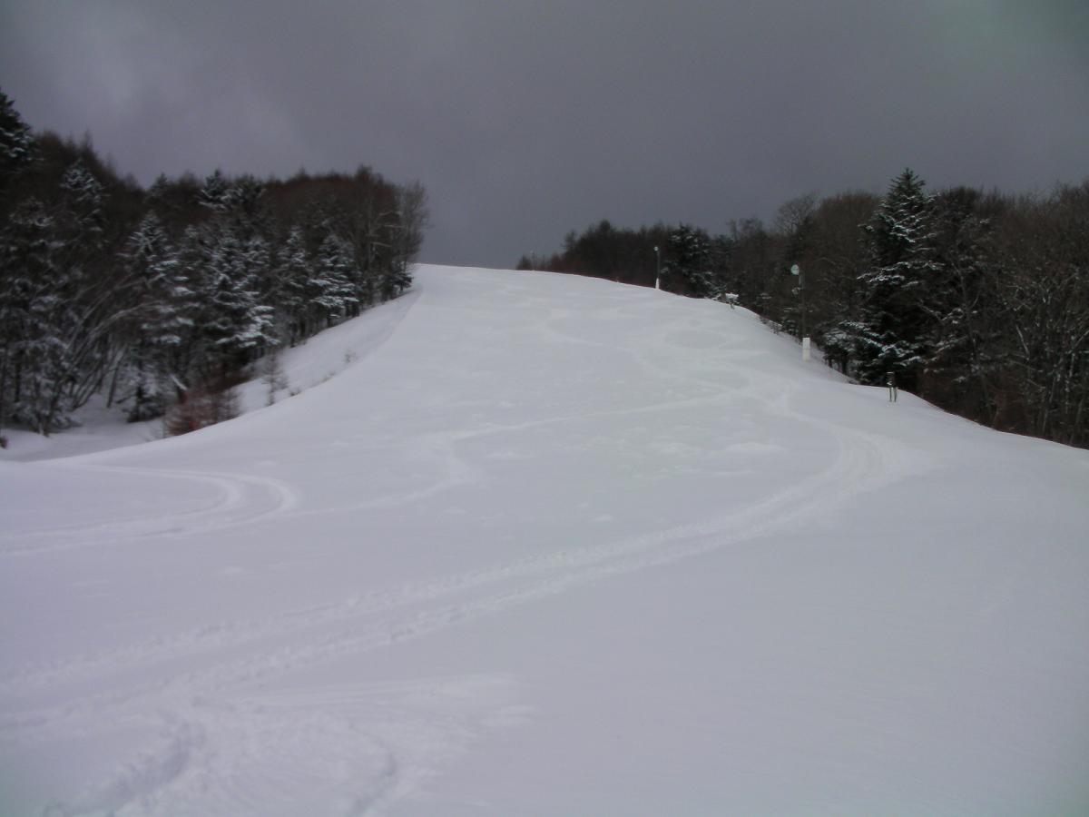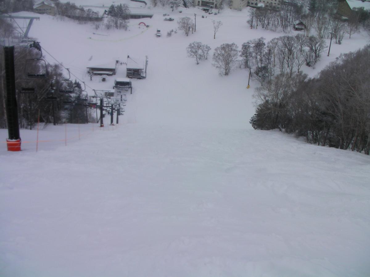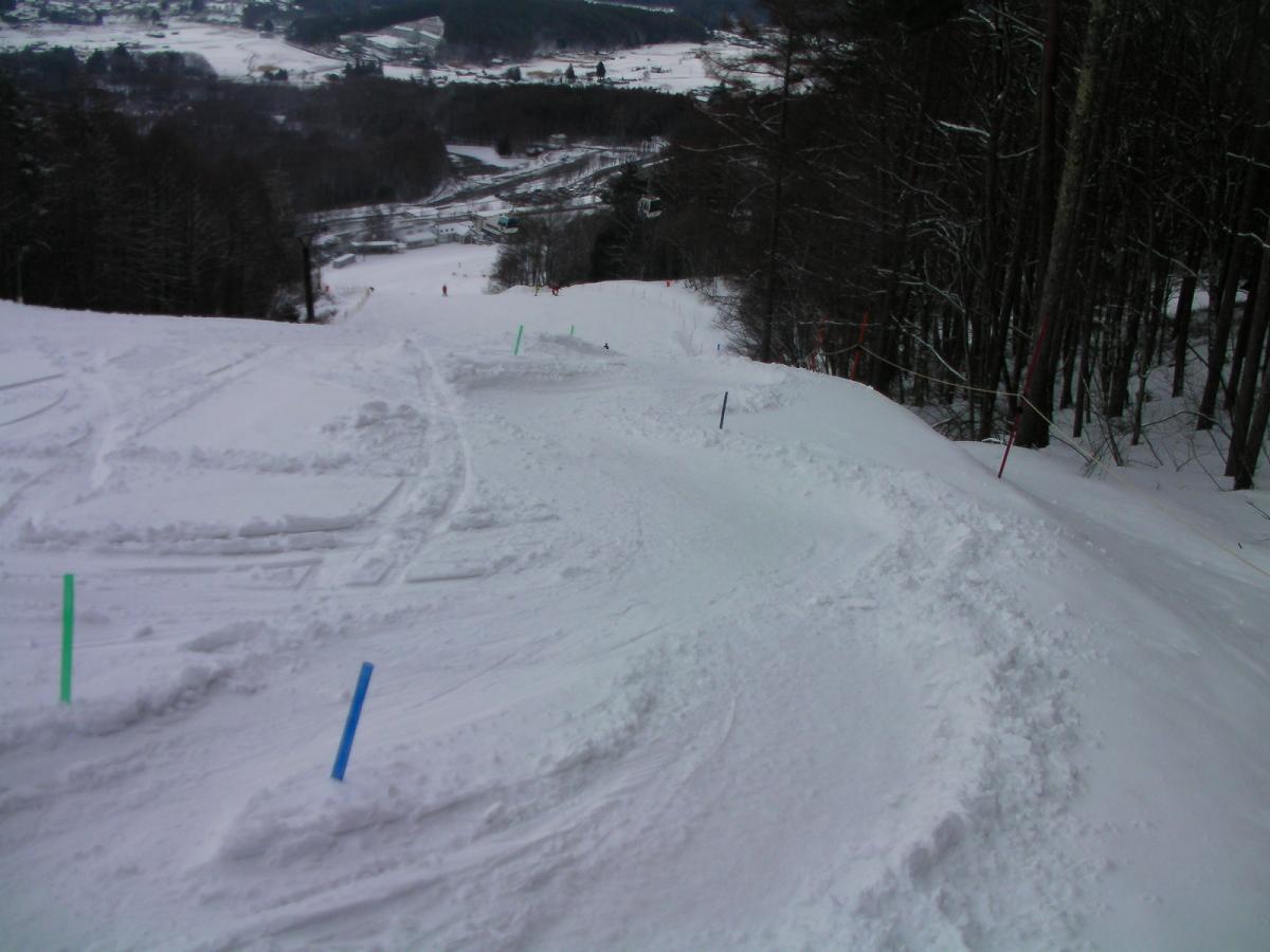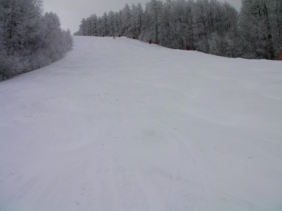 サンメドウズのメインコースのAコースの滑走です。こちらも圧雪後に降雪したようで、すでにモコモコでウネリ始めていました。