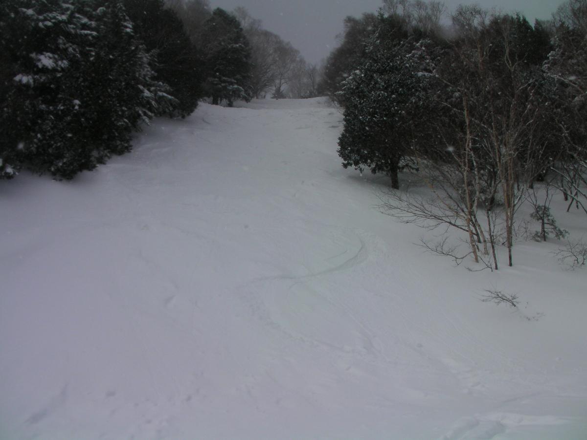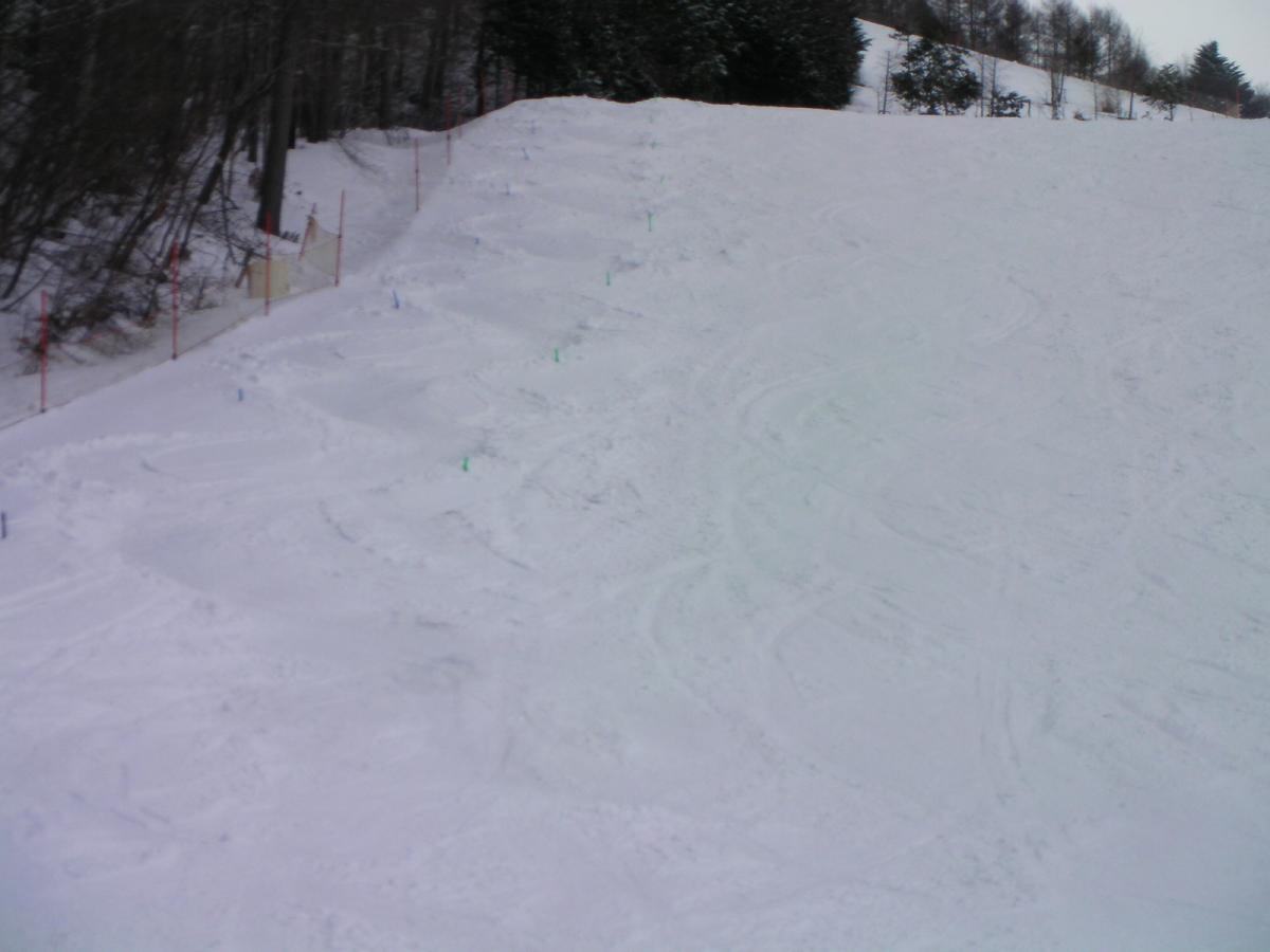 「痛快!コブコブだよ!」のアルペンコースです。完全未圧雪でコブコブになっており、オオマツエリア唯一の自然コブバーンです。なるべく浅い所を探して滑りましたが、凍った滑走跡で板を回す幅が無くなって途中で撮影を断念しましたorz
