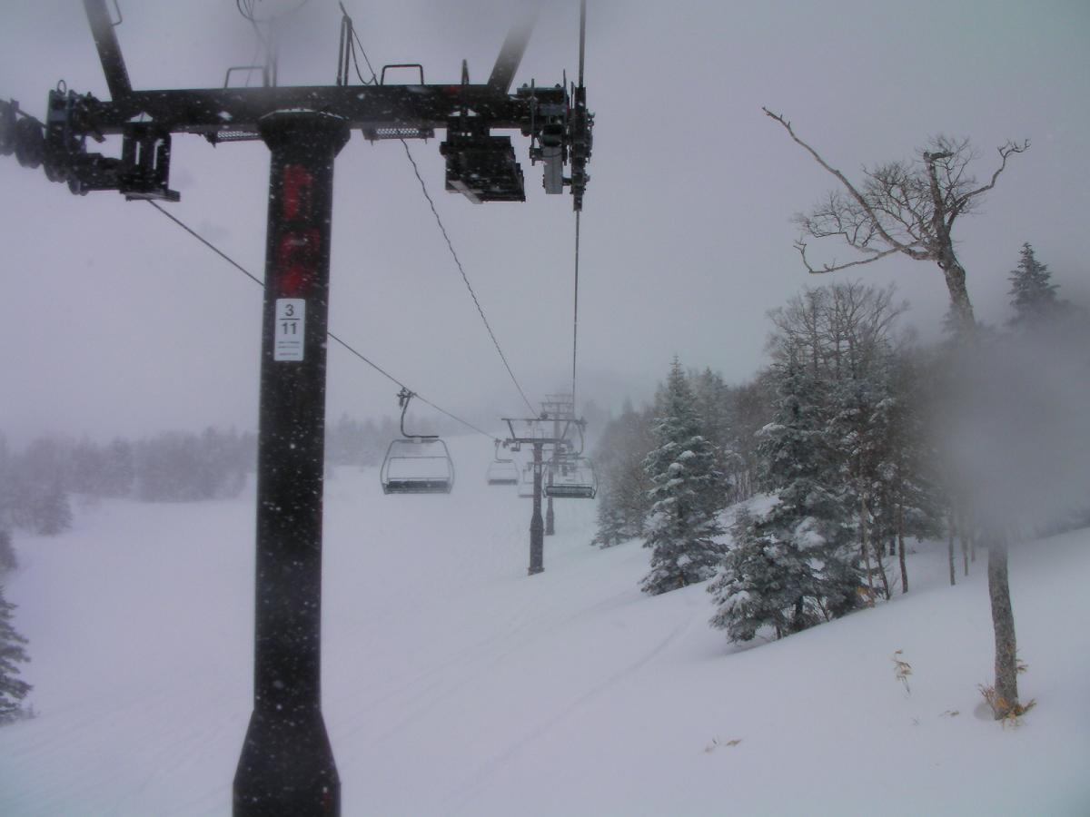 右大外を滑るphilosophyコースの滑走です。だんだん吹雪が激しくなり見通しも悪くなってきました。林の中は魅力的でしたが自重しました(苦笑)対面にかかるペアリフトは運休なので、SOPHIAコースは滑れませんでした。