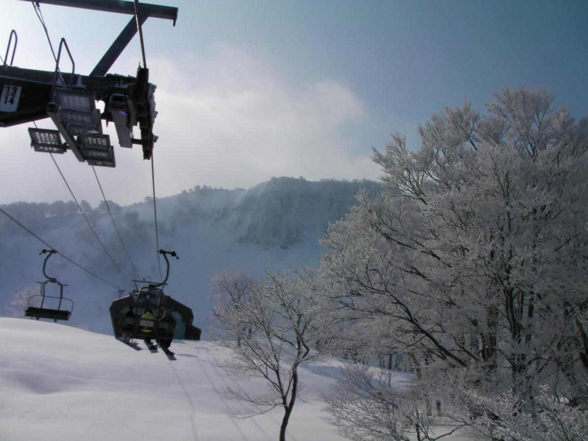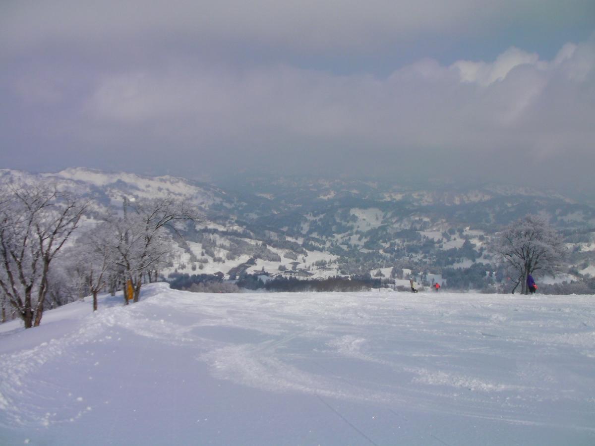 ゴンドラの運行が始まったので山頂まで上りました。長いゴンドラで15分近く乗るようです。山頂菱ケ岳の稜線は急斜面で雪庇も大きく、雪崩が起きそうな感じでした。標高が上った分雪質も向上しました。途中のショートカット斜面は見圧雪で新雪も楽しめました。全体的には緩斜面主体でルーチンで楽しめるという感じではありませんでした。
