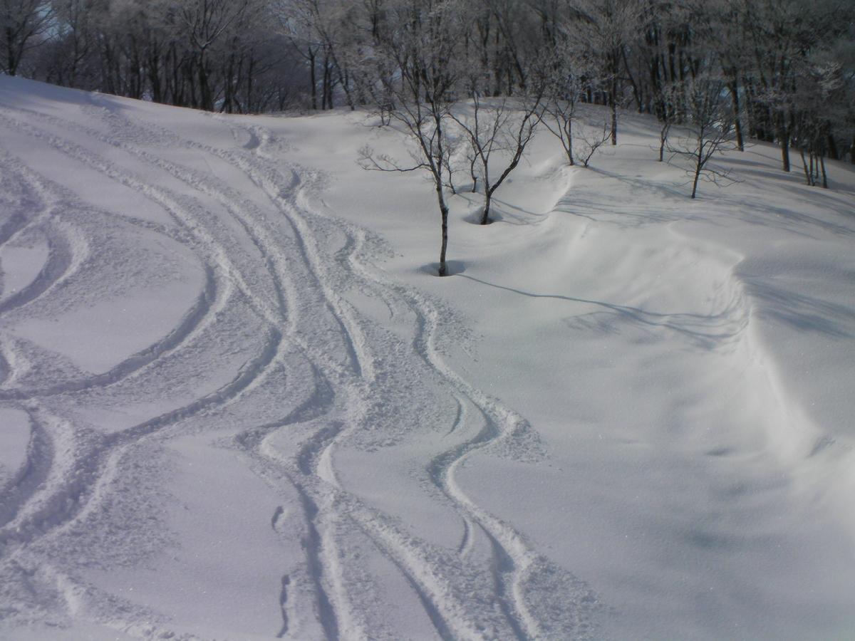 西側の山頂から、エアターン→蛇堀→ナイターと繋いで滑りました。