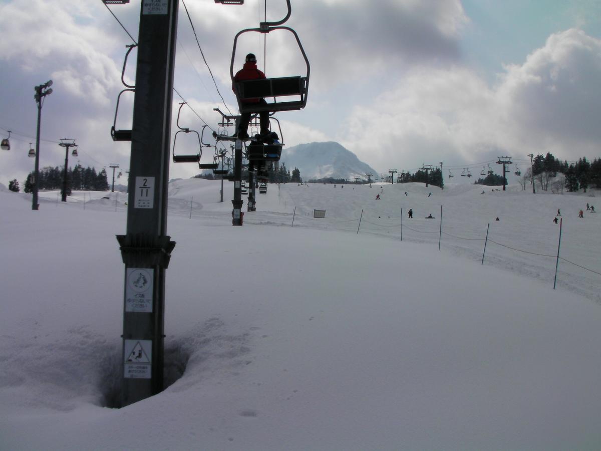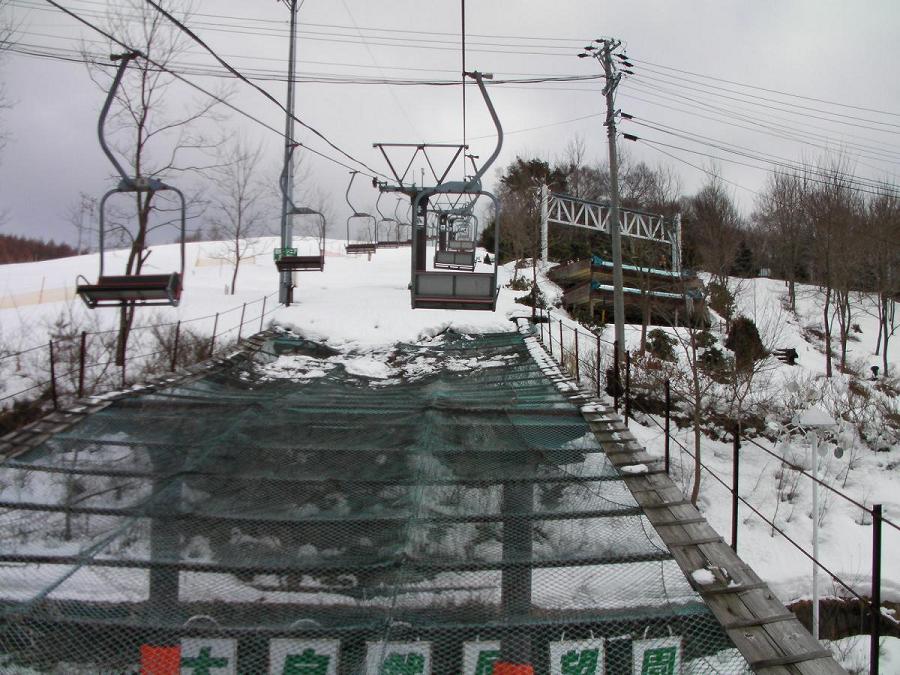 ユルユルの丘スキー場のリフト乗車風景です。このリフトは夏の観光にも使っているようで、高さが低くて足が付きそうな感じです。大雪が降ればヤバイかも?