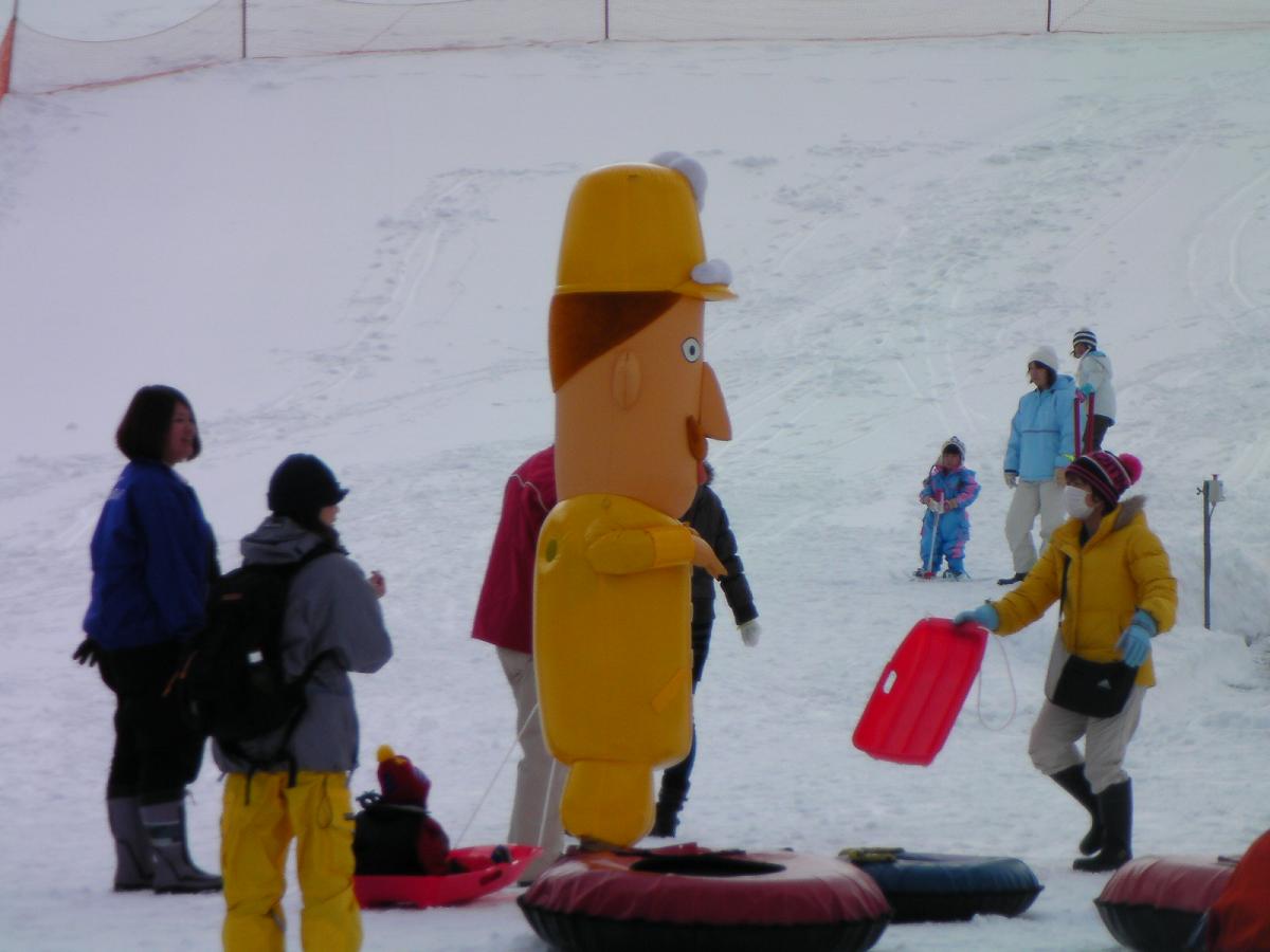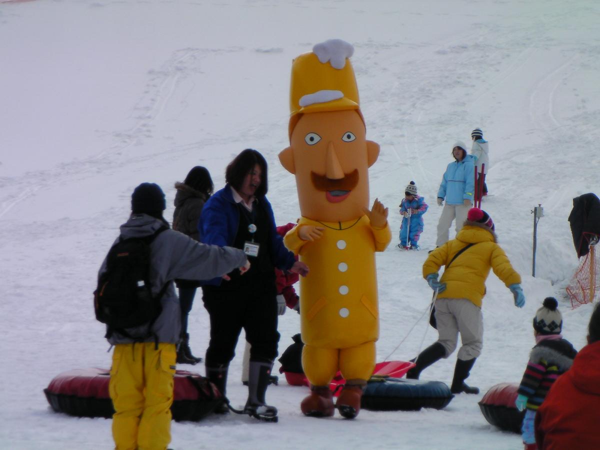 上部ゲレンデに居るときレルヒさんの歌が連続でかかり、脳内がレ~ルヒ、レルヒ、レルヒっさん!で一杯になりましたが、どうもこれがレルヒさん登場の合図だったようです。キッズエリアにて生レルヒさんを発見。大人気です!