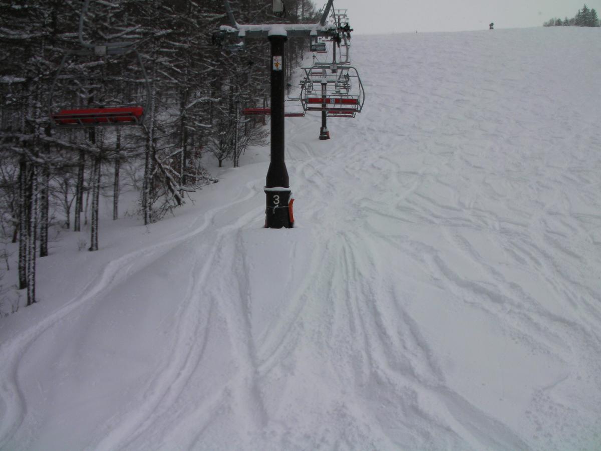 第5ペアを右手に降りて滑り出すパウダーコースの滑走です。比較的荒れの少ない不整地の上に薄い新雪が乗った状態です。下地が凍っているようで、硬くて余り楽しめるバーンではありませんでした。午後になって新雪が取れると、アイスバーンがあちこちで顔を出していました。名前とは裏腹なテクニカルなバーンでした。