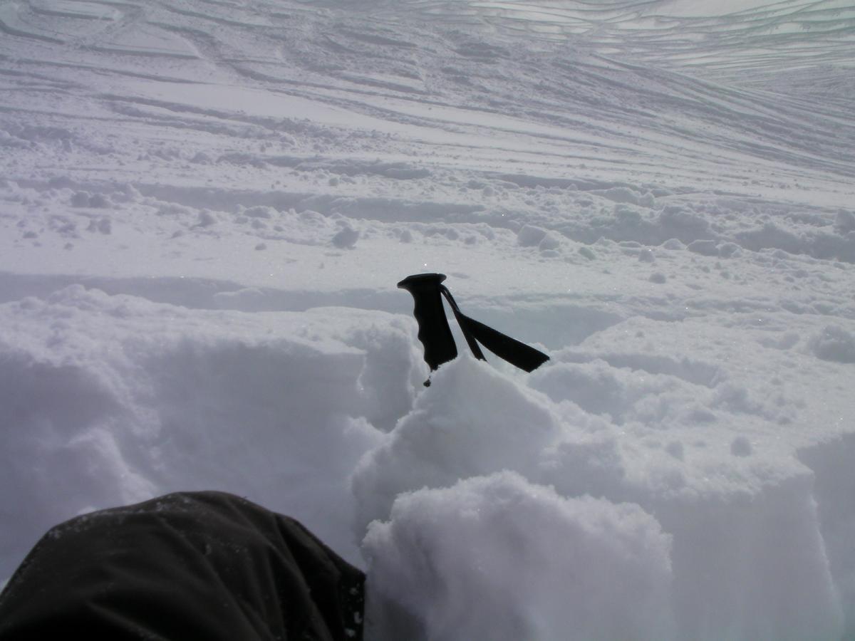 キャニオンコース右端を滑るコブラーSK氏。一番深いところは腰パウかな?撮影のため板を脱ぎましたが、自重で太腿の中間辺りまで嵌りました。ストックはグリップ付近まで刺さりました。