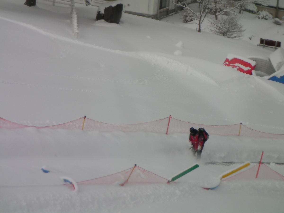 大会終了と同時にポール撤収作業が始まり、それほど時間かからずにかもしかコース(アルペンコース)が開放となりました。最大25度平均16度1200mというスペックです。127人が2度滑った後ですが、深く掘れた所は無く、いかに硬いバーンかが判ります。この後撮影無しで滑ったら、アイスバーンが点在しているのが確認できました...フリーで滑ってゴールライン辺りで1:30位かかっています。出場選手の皆さんどんだけスピード出してるんだ???