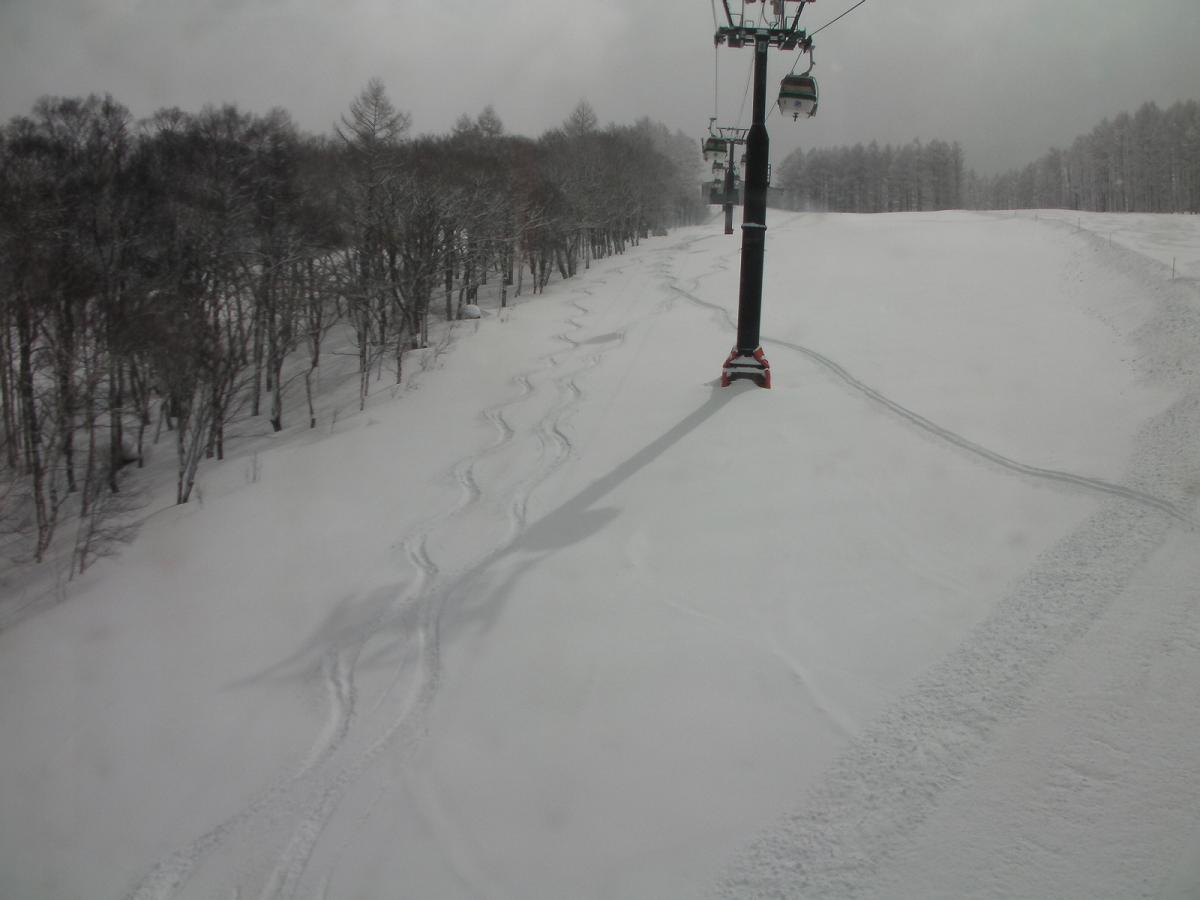 ゴンドラの線下は面ツルのノートラックでした。15~20cmの脛サイズ。軽いドライパウダーで気持ちの良い滑走が出来ました。若干硬い底当りを感じました。前走者は同行のコブラーSK氏です。