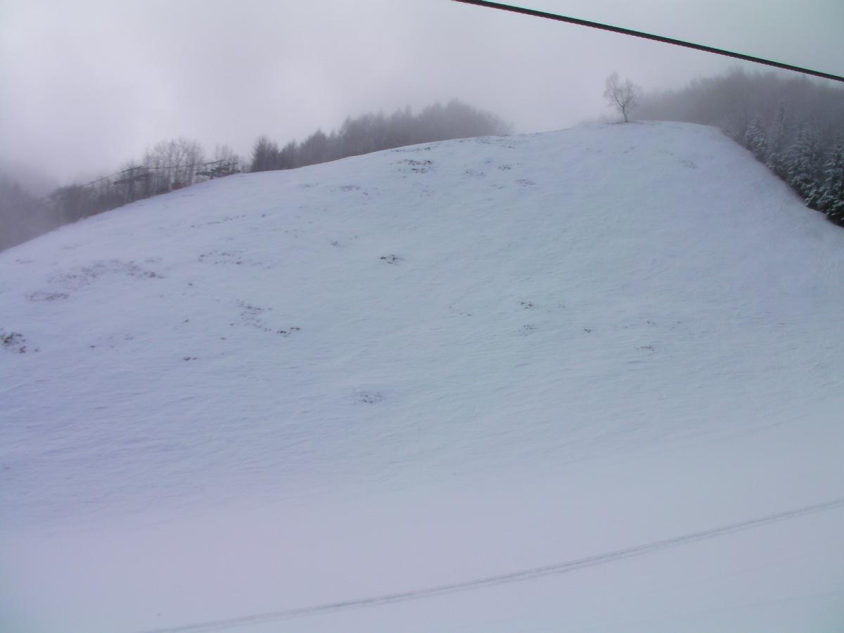 肝心のスキーですが、天候回復が遅れて出発時には小雨、R19の木曽路でミゾレ、やぶはらベースで湿雪と霧。ピステン跡がかすかに判る程度の新雪が積もっていました。昨日からずっと気温が高かったので下地まで柔らかくなっていて、滑らない新雪と相まって不整地はイージーでした。11時過ぎに太陽が出て陽が当りだすと一気にSTOP雪に変身~。今季初の妖怪足掴みさんと遭遇しました。