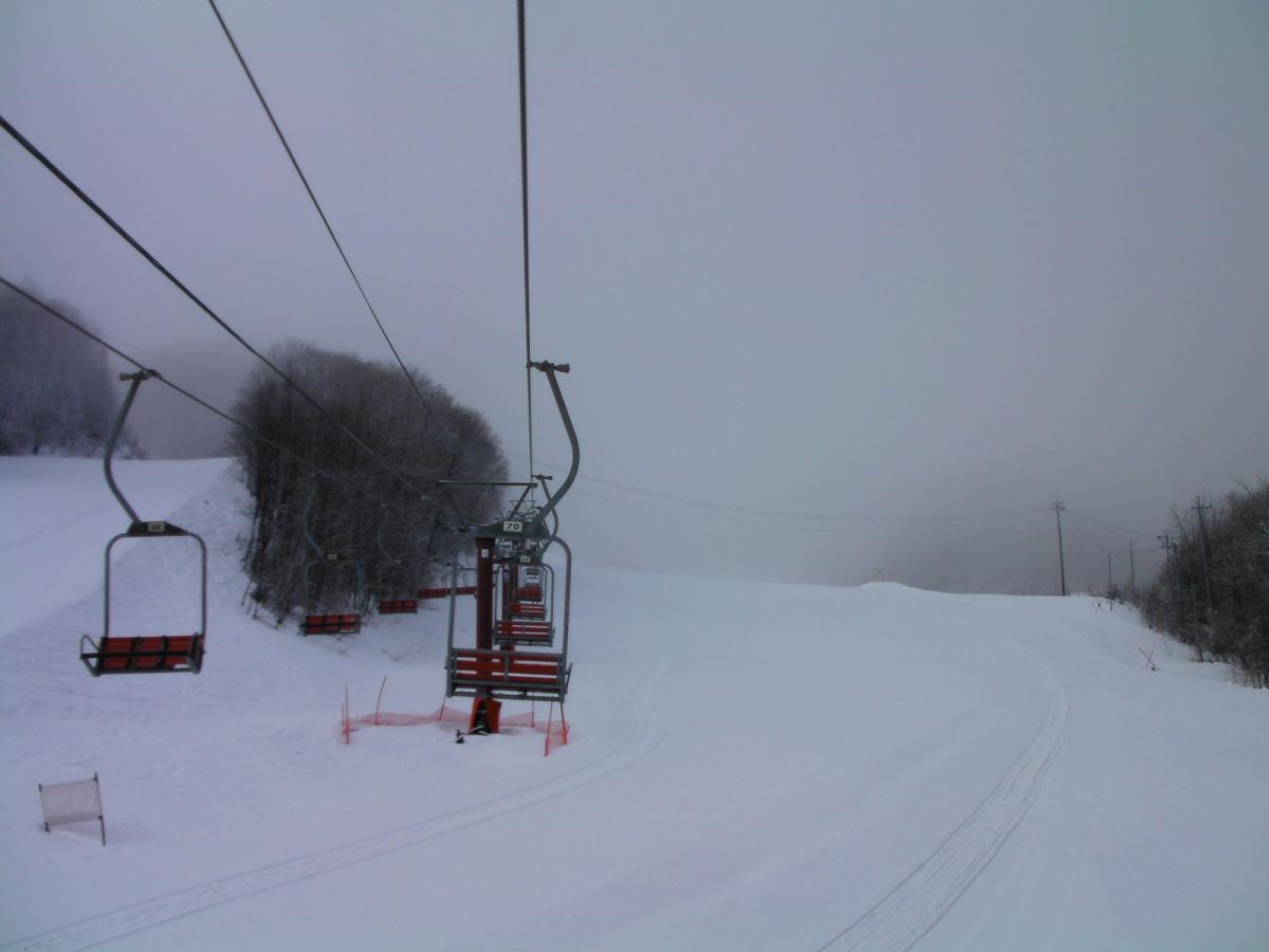 定刻より大分早く運行開始となりました。初訪問の初滑走は第3クワッドを真直ぐ前に下りて、その先を左に滑り出すエアターンCの滑走です。硬めの圧雪の上に薄っすら新雪が乗った状態でした。小雪がちらつき、若干視界が悪く、思い切った滑走は出来ませんでした。