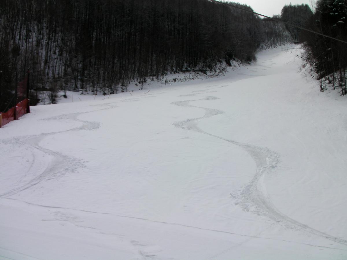 パークが設置されているコースです。皮肉なことに最後に踏んだようで、新雪がないので滑りやすいバーンでした。昨日は日中はずっと雨、夕方から雪に変わったようですが、15~20cmの新雪が積もっていました。特に固まった所も無く、重くも無く、普通に楽しめました。
