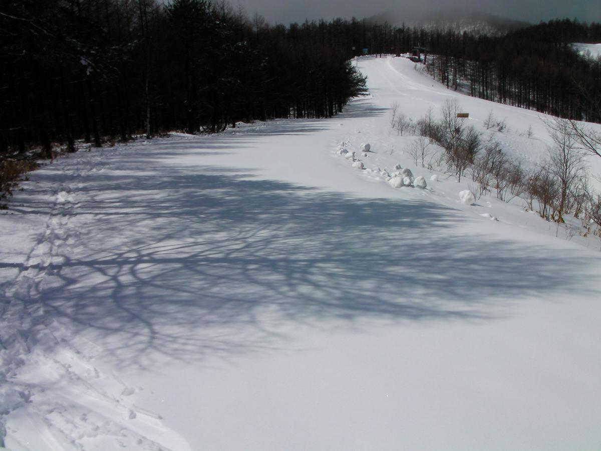 第1ペアで滑る初心者ゲレンデの滑走です。中急斜面・不整地がメインのほうのき平にあっては、貴重な緩斜面です。