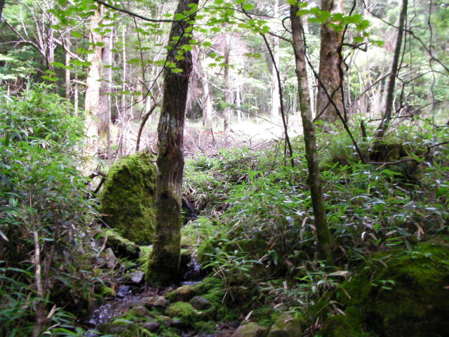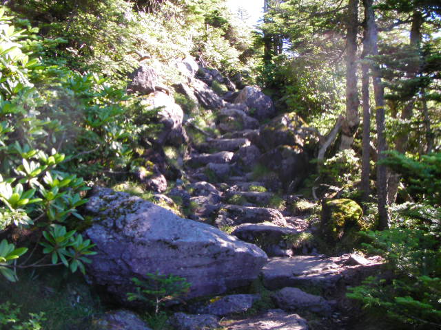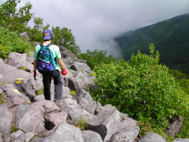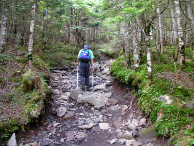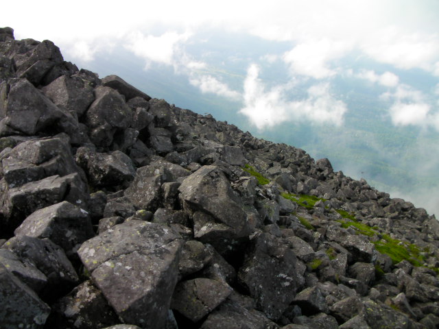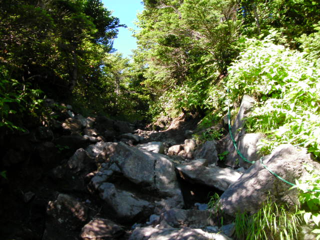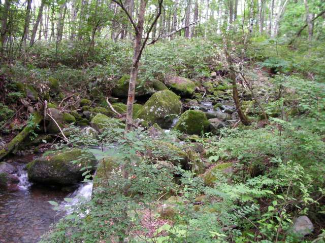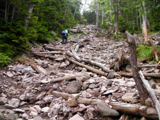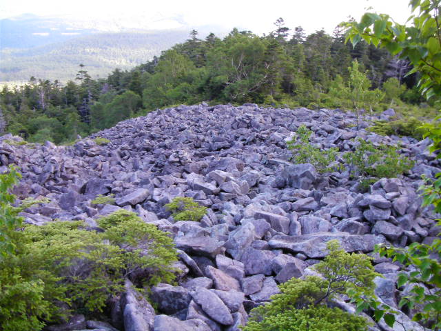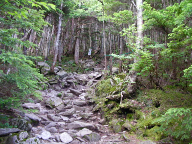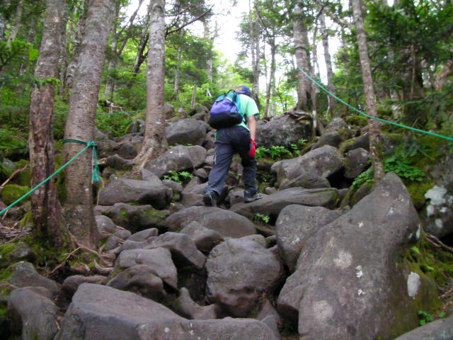 蓼科山七合目登山口を出発して35分程度、登山道を右に分かれた所にある天狗の露地の風景です。抱きかかえようとすれば抱えられそうなサイズの岩が累々と積み重なっています。視界の無い樹林帯歩きに飽きる時間帯にある場所なので小休止には良い場所かも知れませんね。