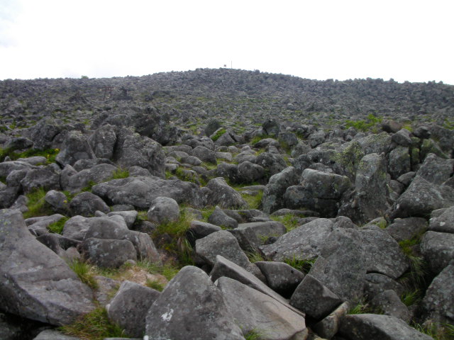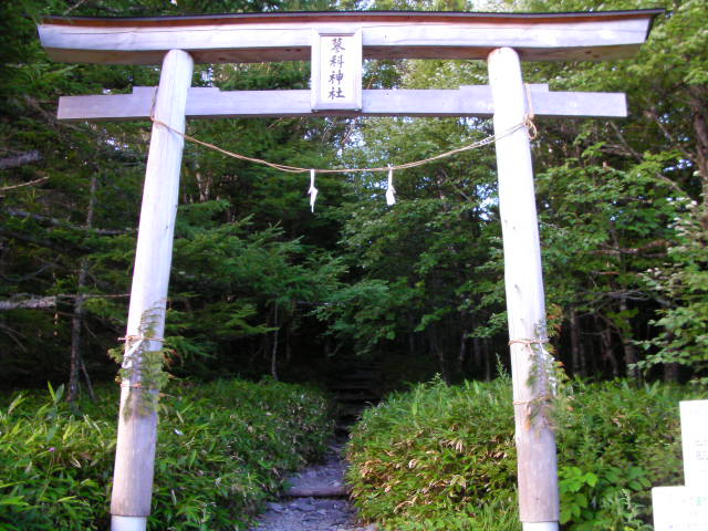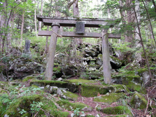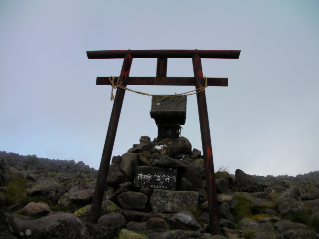 蓼科山2530mの山頂部は岩がゴロゴロした野球場ほどの大きさがあります。ほぼ中心部と思われる所に蓼科神社が祭られています。山頂碑のある所が一番高く中央部は窪んでいてここからは火口の縁と空しか見えません。ここを横切り西端まで行くと再び視界が開けます。