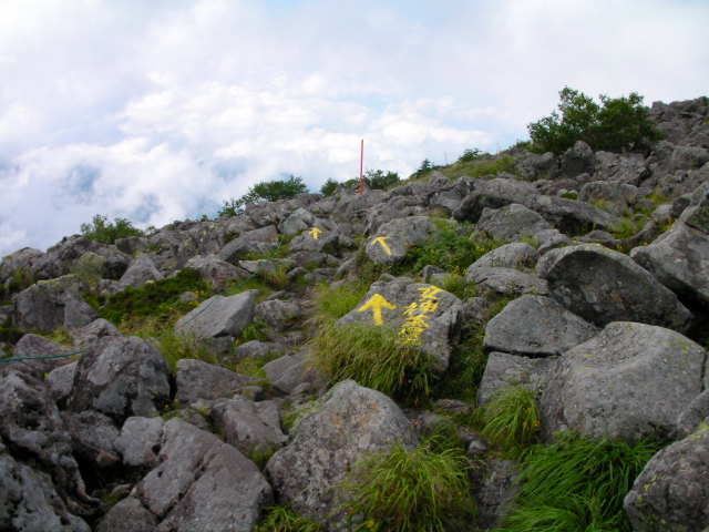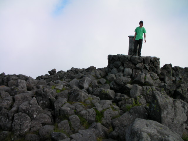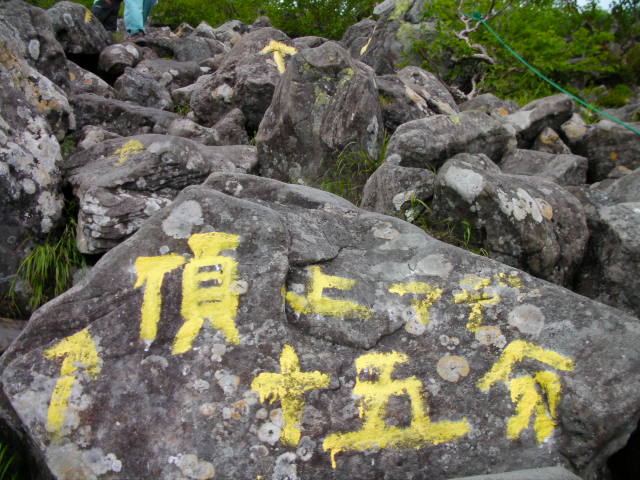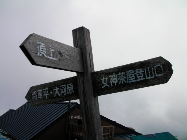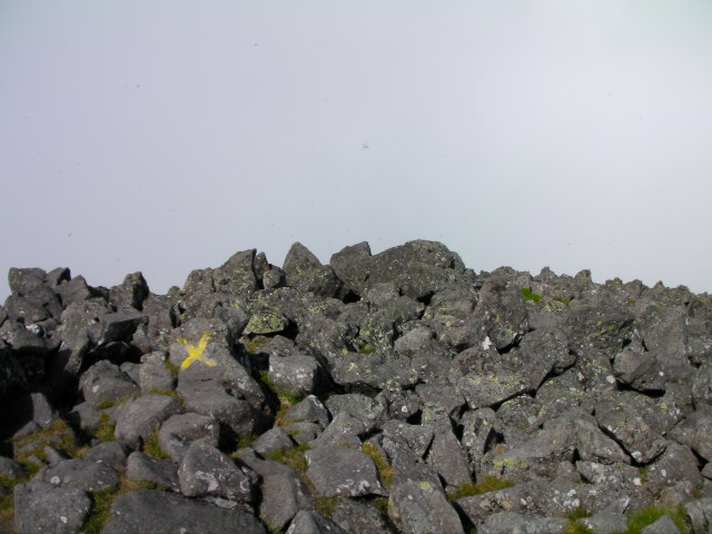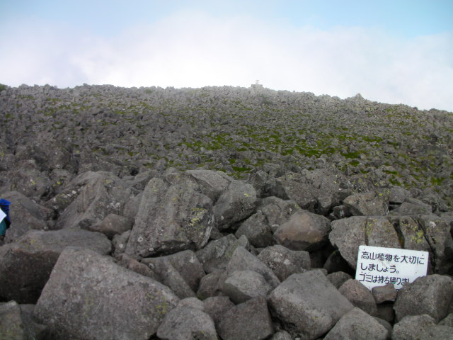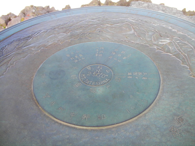 蓼科山2530mの山頂部西端に方位盤が設置されていました。1960年の刻印があったので今年で50年を迎えたようです。晴れていれば南八~南アルプス~中央アルプス~御岳~乗鞍~北アルプスの展望が良いと思いますが、今日は濃い霧が東の方から次々と流れてきて1時間ほど粘ってみましたが霧が晴れる事はありませんでした。残念!