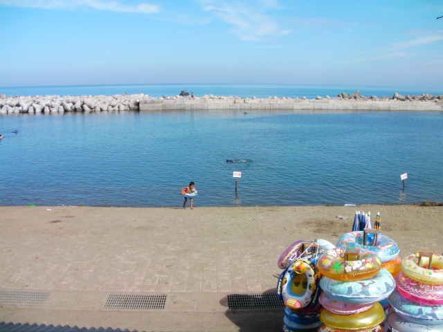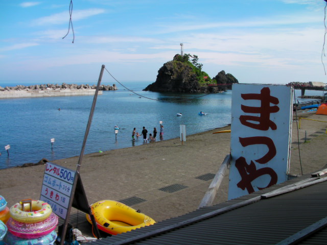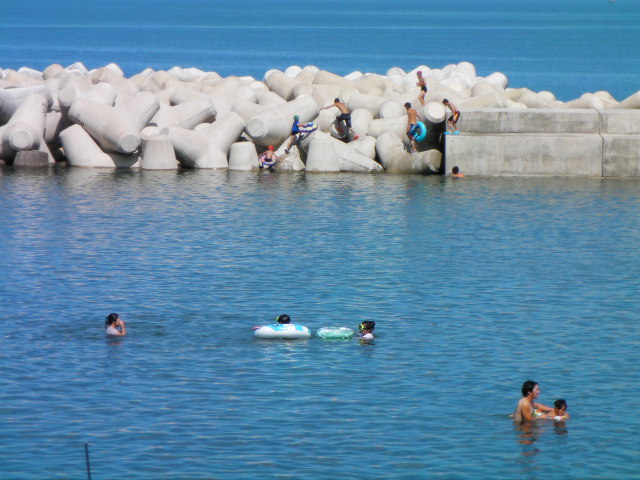能生海岸の様子を浜茶屋の2階から見ています。一昨年防波堤の工事を大々的にしていましたが、完成していてすっかり様子が変わっていました。(昨年は天候不順で海水浴には行きませんでした)以前は遠浅というか、テトラポットまで背が立ち、顔を出したまま行けましたが、今は浜から急に深くなって背も立ちませんでした。あれだけあった砂は何処へ行ってしまったのでしょうか?海岸の砂地部分も随分狭くなってしまいました。