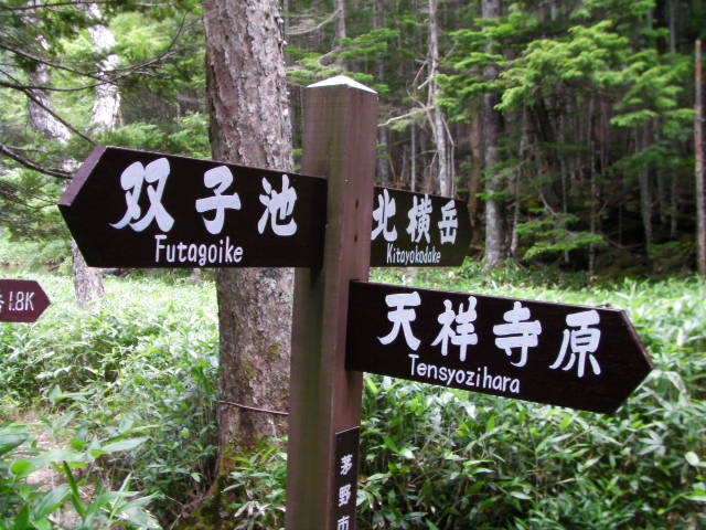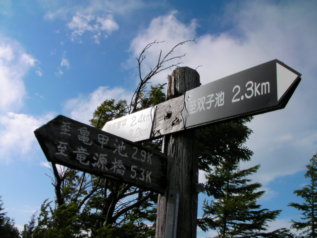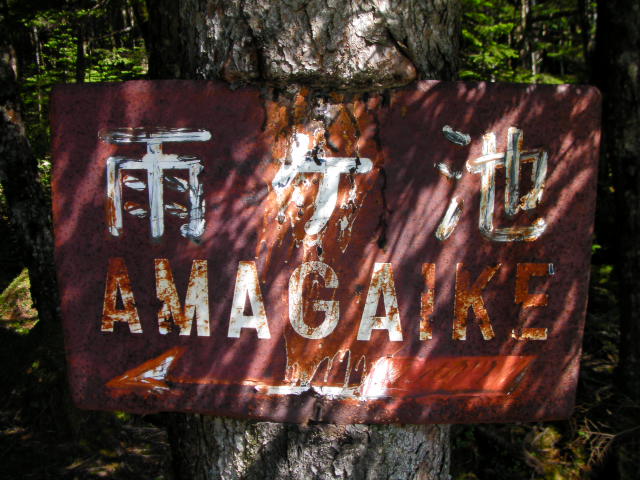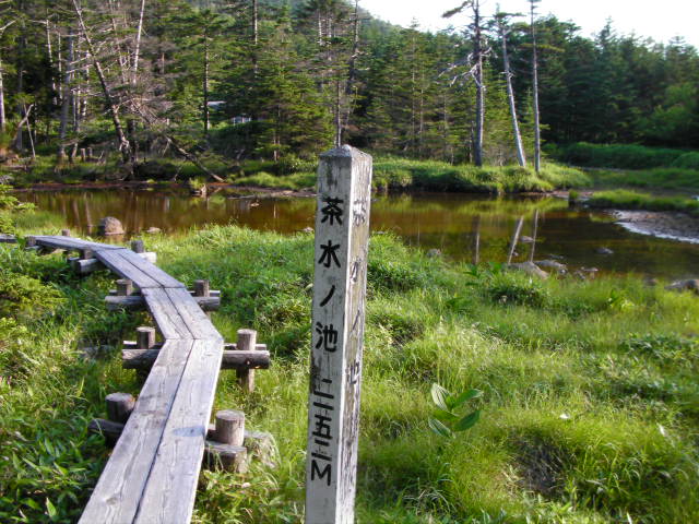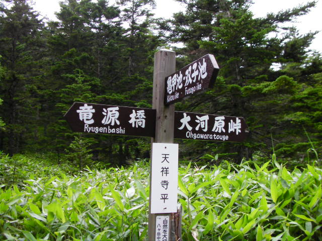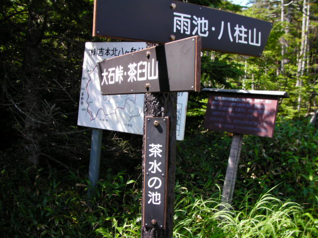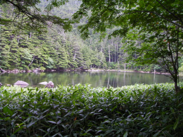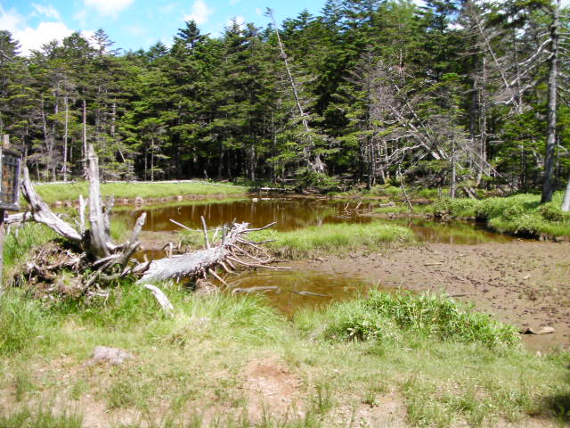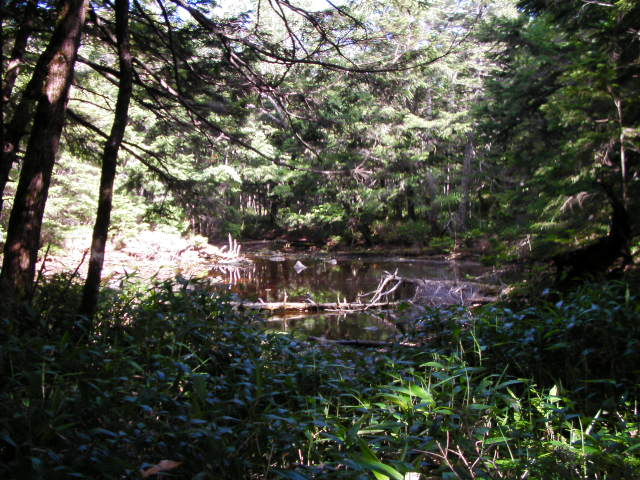 双子池の雌池から20分ほどのアップダウンで到着しました。登山道には倒木が折り重なるようにあって大きな岩ゴロで厳しい道程でした。双子池方向から来ると案内看板はありませんでしたが、天祥寺平から来た方向には案内看板がありました。大きな池ではありませんが透明度が良いようで綺麗な水をたたえていました。