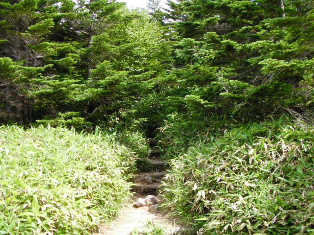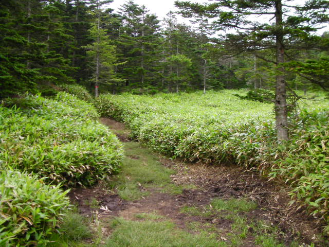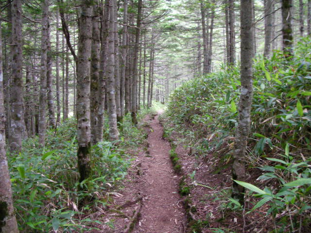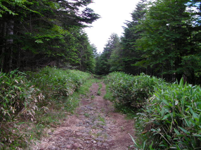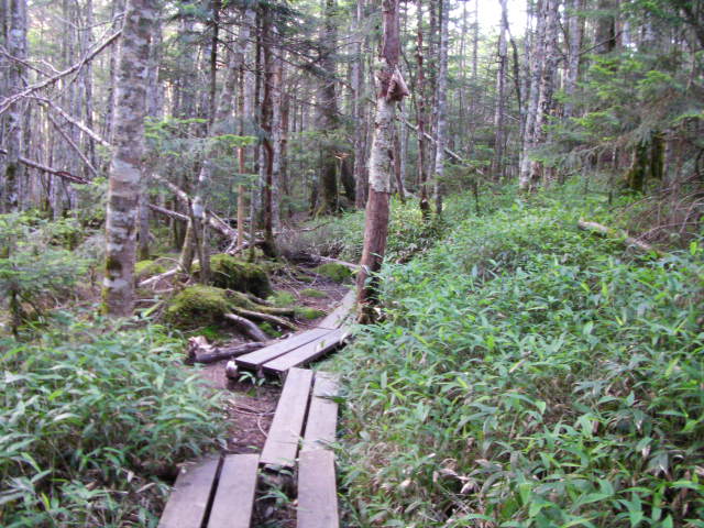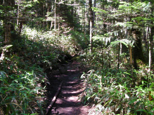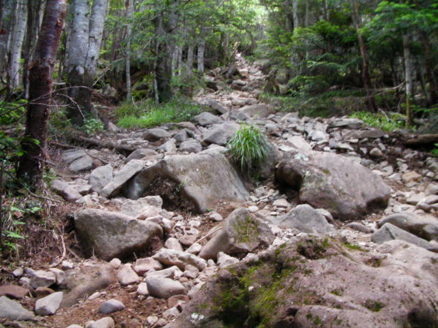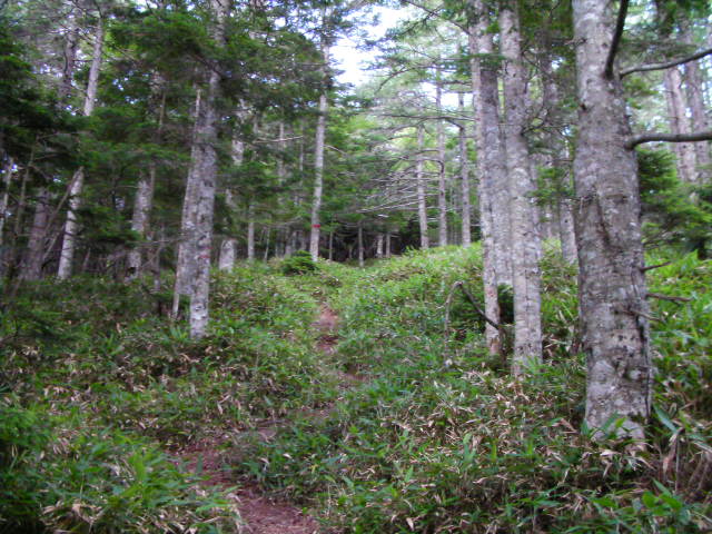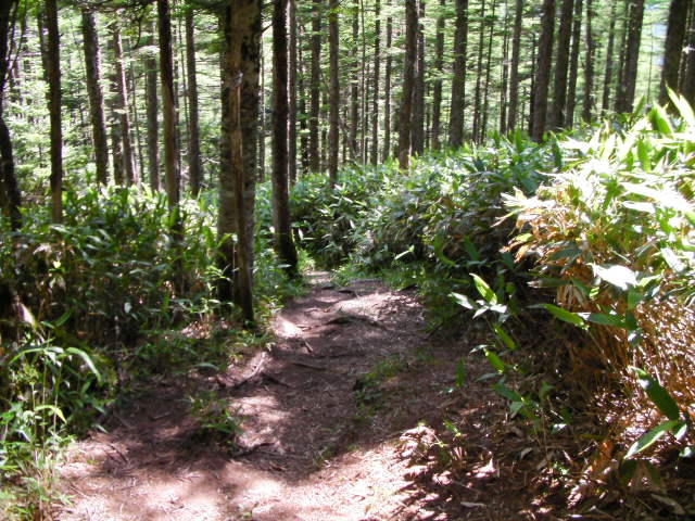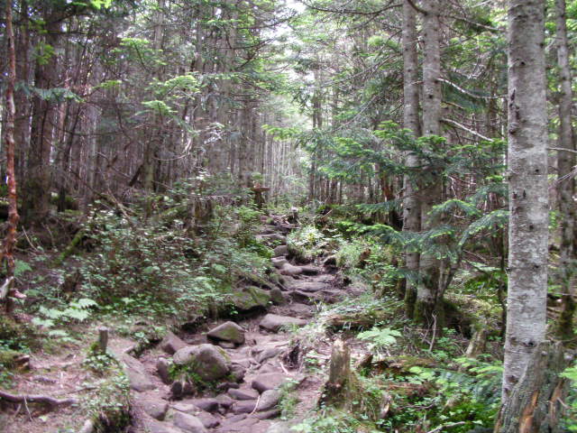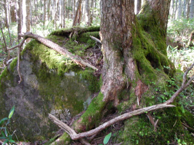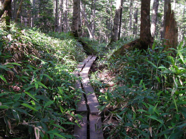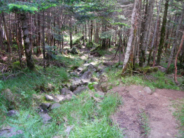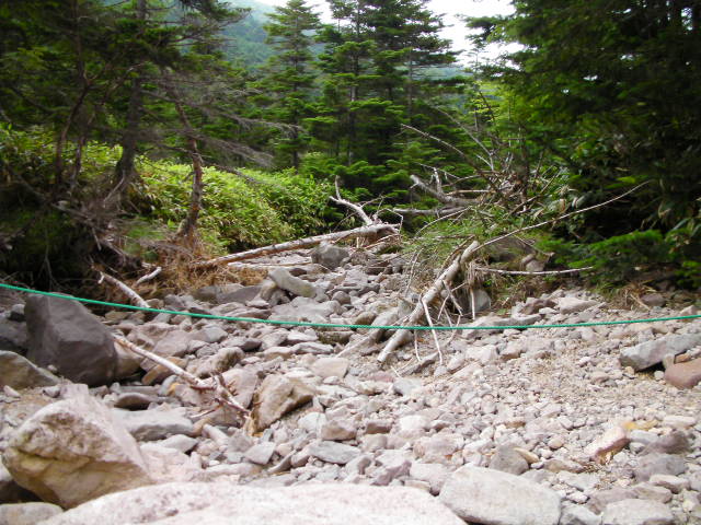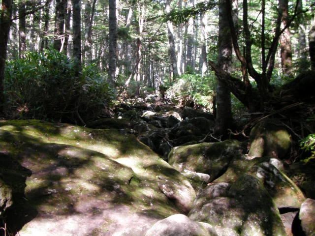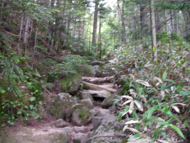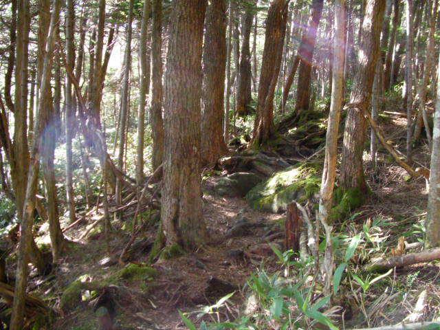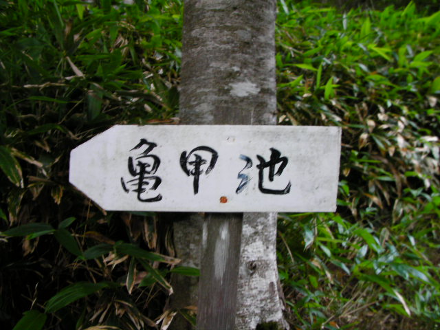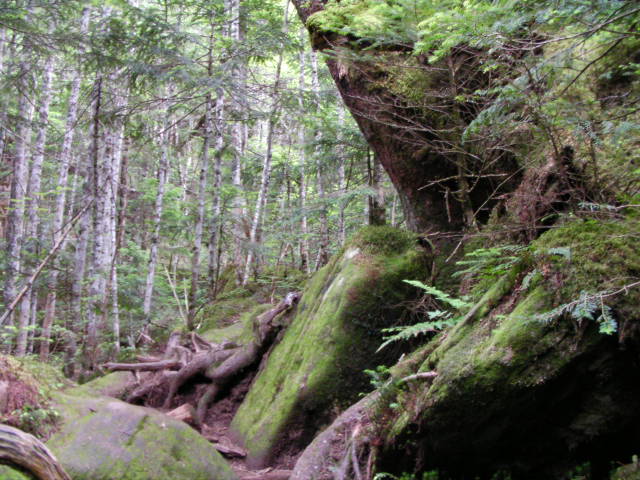 双子池の雌池を離れ、亀甲池へ向かいました。ちょっとした峠のようなルートですが、これが凄いルートで樹林帯は濃いし、ゆえに岩の苔が多くて滑るし、倒木の嵐だし、今までの経験で一番荒れていて厳しいルートでした。峠を下り始めるとご夫婦が休憩していましたが、かなり息が上がっている感じでしたorz