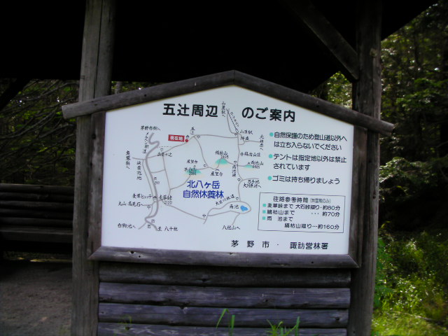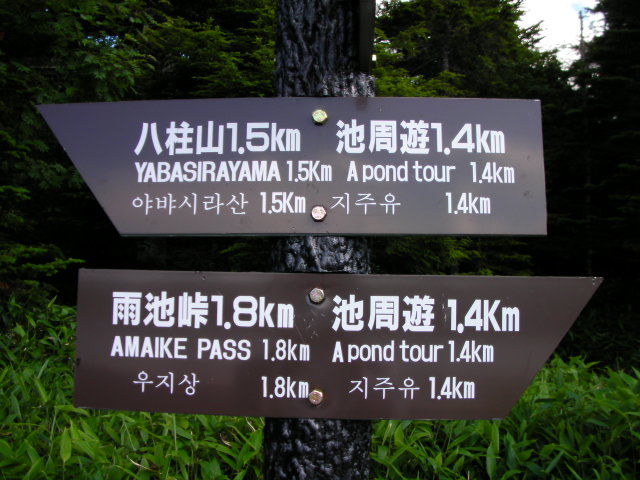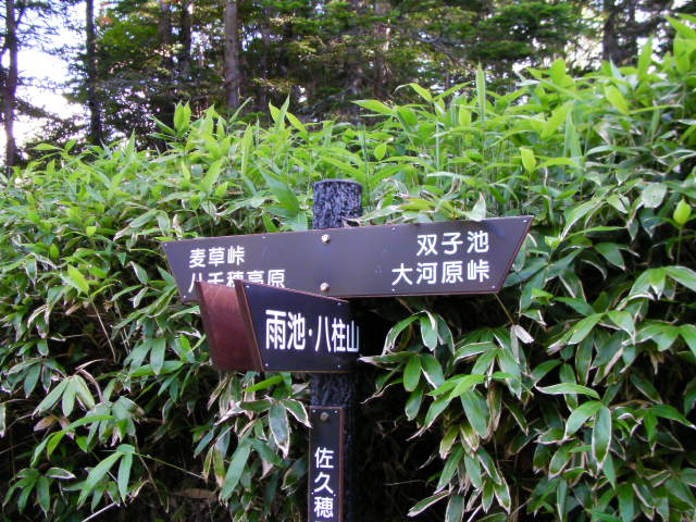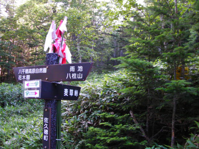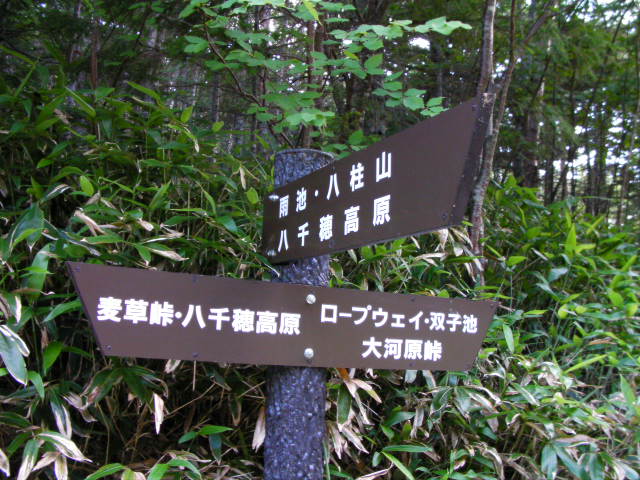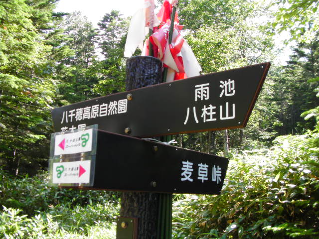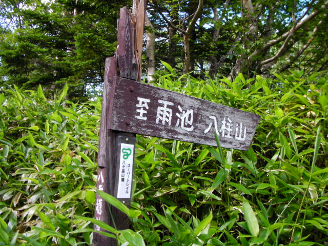 雨池で道標を見ると、八柱山1.5Kmとあったので往復3Km程度なら行けるだろうと思い足を伸ばしてみました。樹林が濃くて見通しが悪く何処にピークがあるのか判らずに歩き始めましたが、行程の8割方が下りで、登りは雨池の取っ付きと山頂直下だけでした(苦笑)ただし八千穂側から登ると急登の連続のようですorz山頂部には電波塔があるだけで視界も殆どありませんでした。ちょっと残念な山でした(泣)