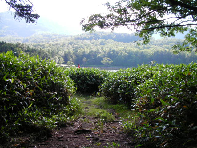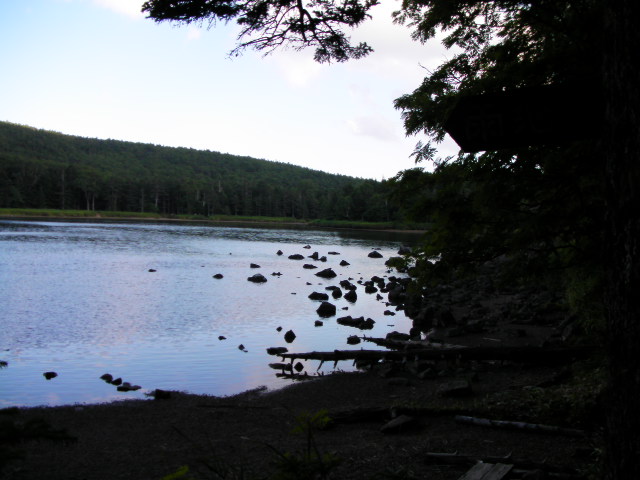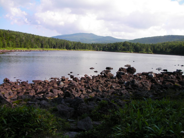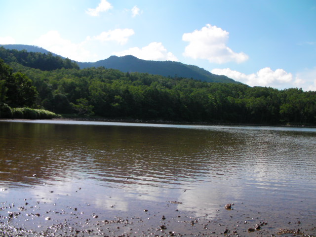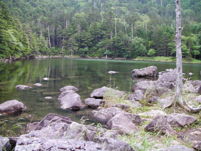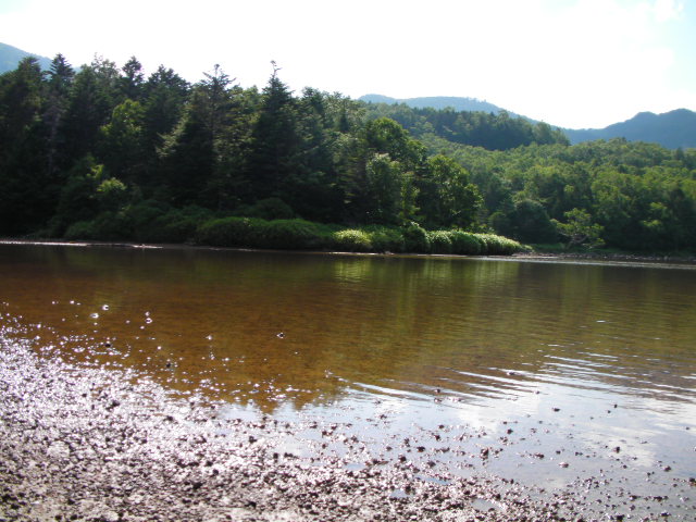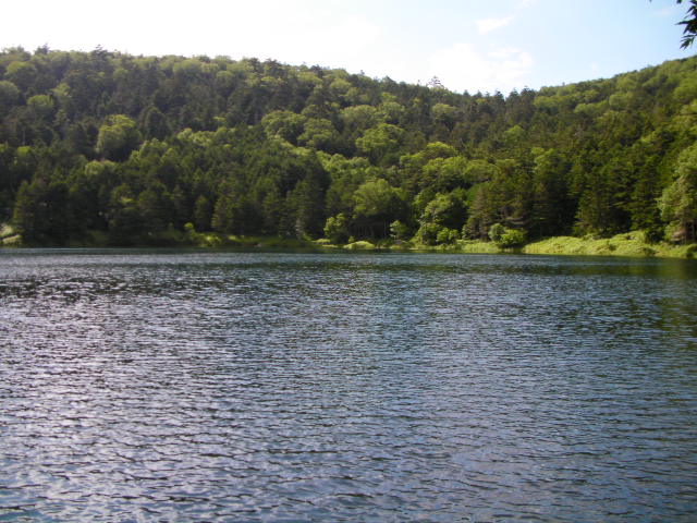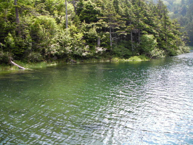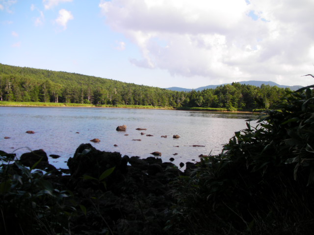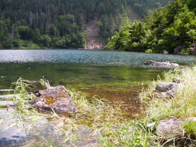 麦草峠から約1時間、緩やかな下りの岩ゴロ道を歩くと到着です。途中は深い樹林帯で視界が全く無いのでこれだけ開けた所へ出ると開放感があります。湖面を渡る風が気持ち良く、逆光で光るさざ波が綺麗でした。