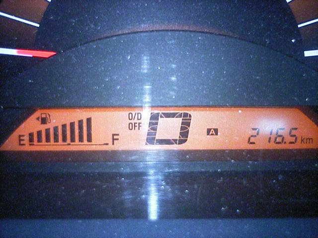 1808岡谷IC出口交差点。216Km走行。燃費計は22.5まで回復。