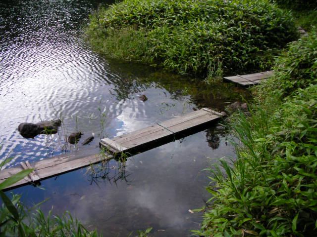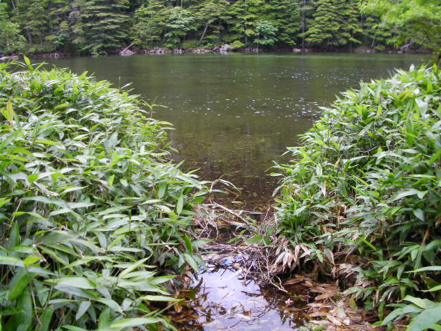雄池に比べ雌池の方が若干標高が低いように見えました。こちらも綺麗な緑色の水をたたえていました。普段より水位が高いのか、池沿いの桟道は水没したり浮いたりしている所があって、新しい踏み跡の迂回路が出来ていました。半周した所にキャンプ場がありました。順光になり水中を良く見たら魚が泳いでいてビックリ!誰かが放流したのでしょうか。