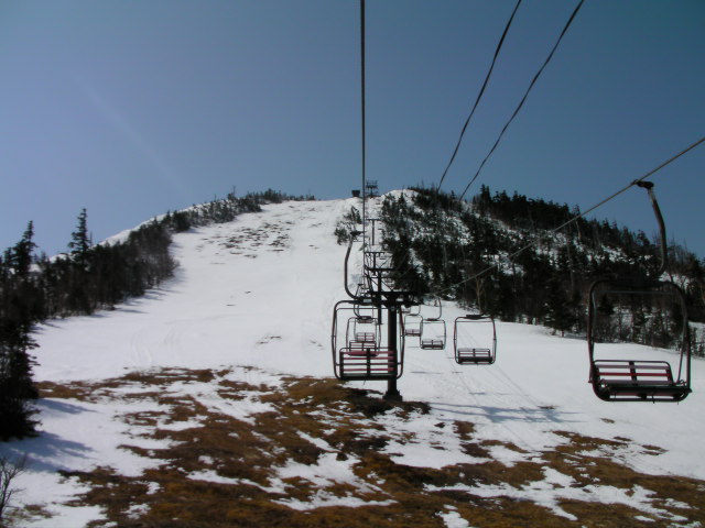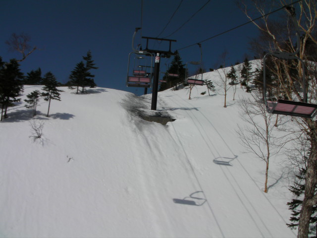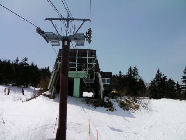 全長3193mで関東最長のゴンドラ山頂駅の標高が2050mです。スペック上のTOP標高は2100mです。最高地点は第4フーガと呼ばれる自動循環ペア(高速なのかなぁ?4m/sには思えなかったけど)の山頂駅となります。最高地点に登る為第4フーガ乗場を目指します。雪は既に緩み切っていてざくざくの大荒れでした。しかし滑走性は非常に良かったです。