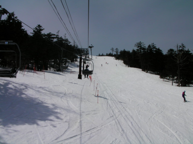 思わぬハプニングでゴンドラ山麓駅まで滑ってしまい、二度目のゴンドラ乗車で上がってきて、本白根第1ロマンスリフトに乗ってみます。スキーもスノーボードも持たない所謂観光客もちらほら見受けられました。
