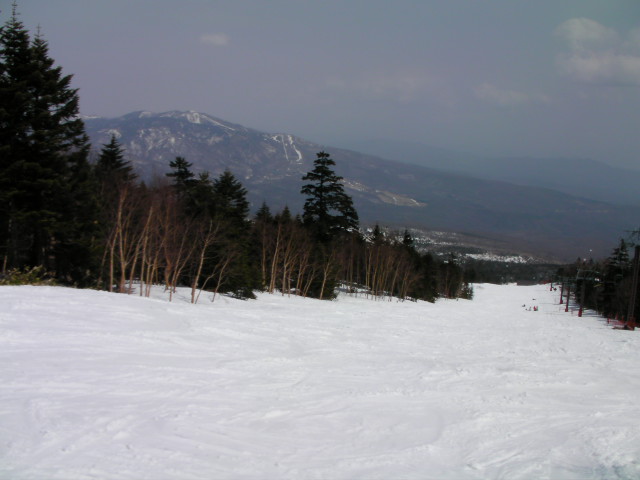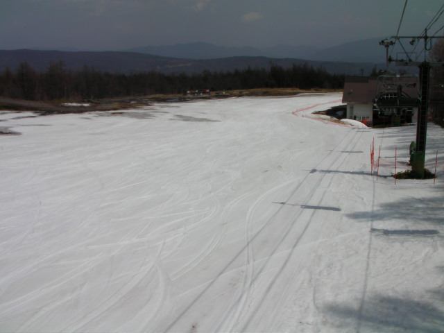第4フーガを左に降りて滑るプレストコースです。滑り出しがたらたらですが、浅間山が良く見えました。パルコールでは唯一の上級表示で、950m/標高差180m/最大24度/平均13度というスペックですが、八方尾根基準だと初級コースに分類されるかも?
